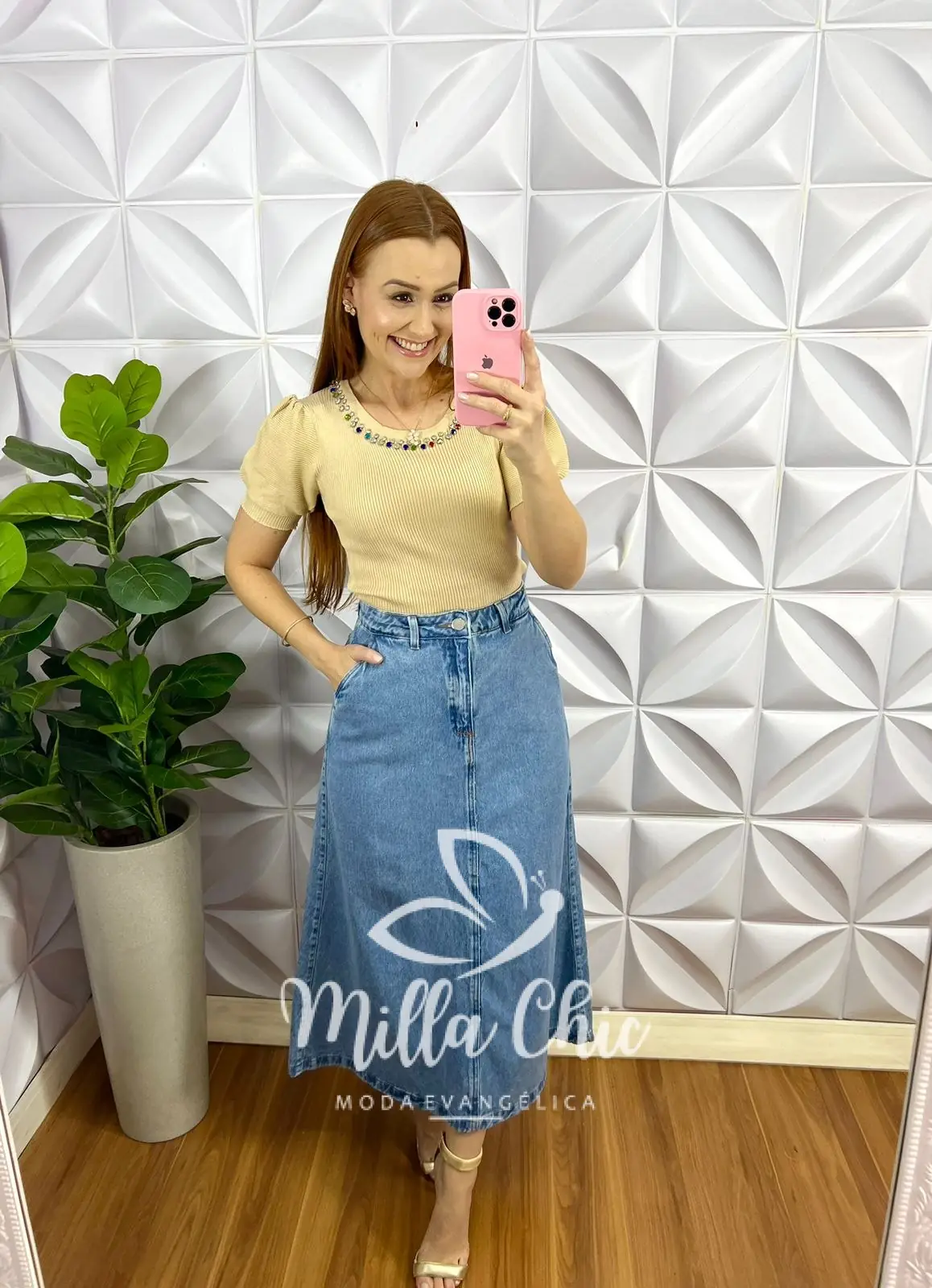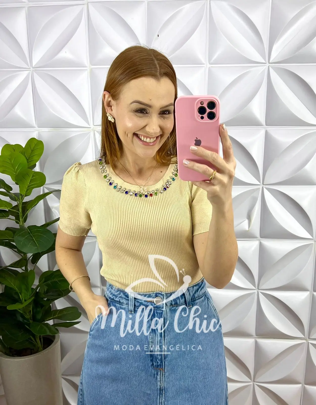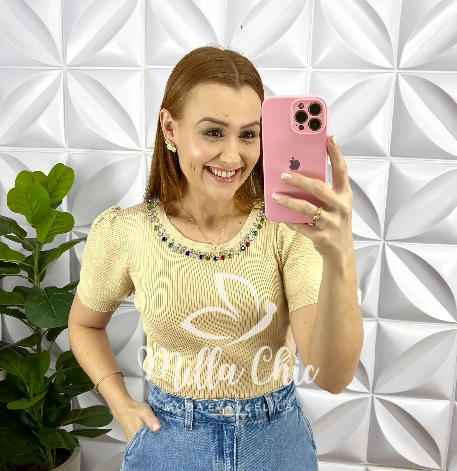 Blusa Trico Com Bordado De Pedraria Na Gola Cressida - Areia - Milla Chic
