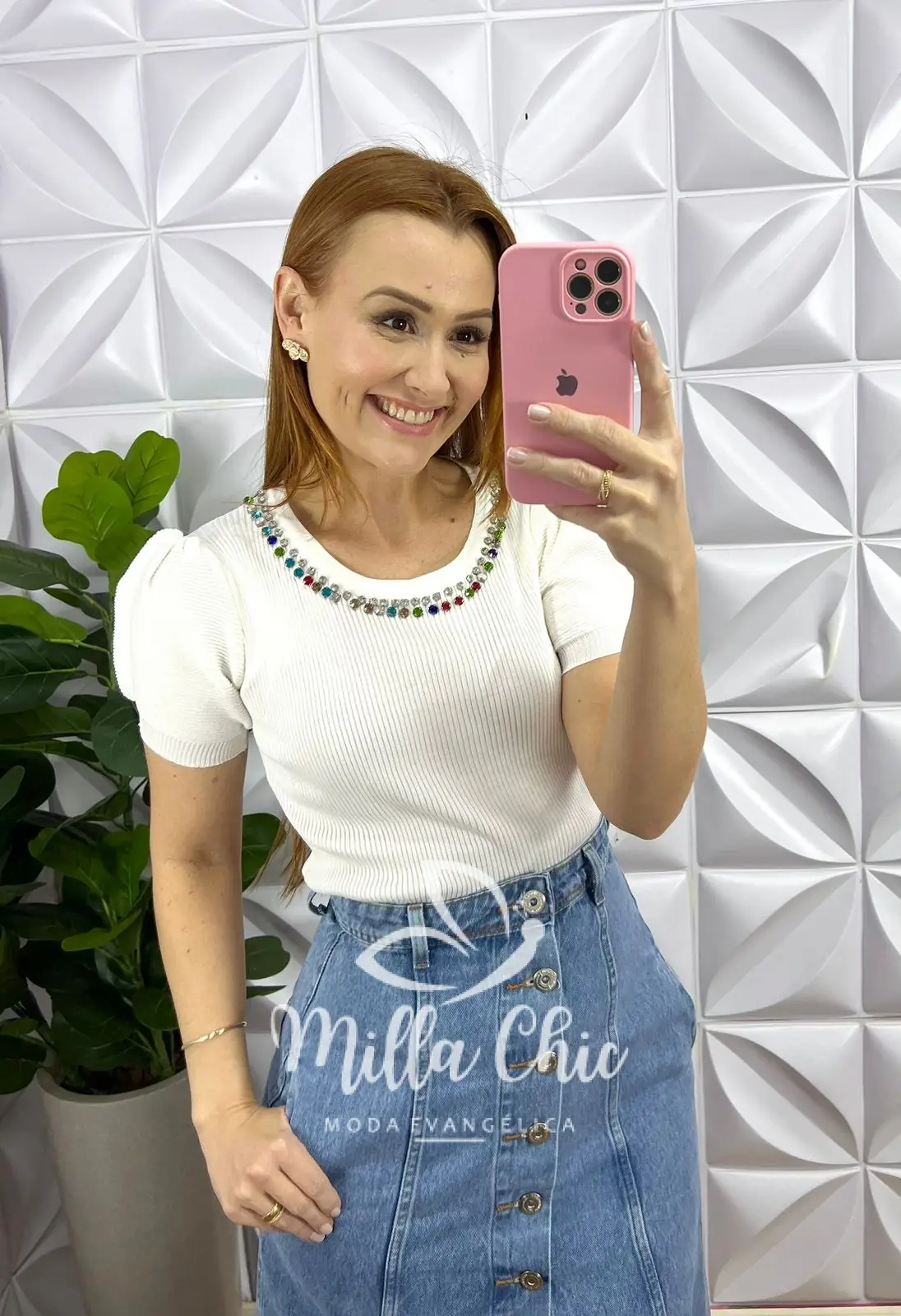 Blusa Trico Com Bordado De Pedraria Na Gola Cressida – Branca