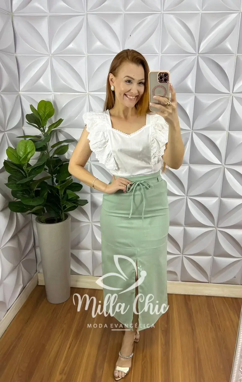 Possui: Estilo Cropped, Decote coração, manga babadinho com bordado de borboleta, recorte nas laterais, caimento reto, zíper na lateral, nao possui forro, comprimento ideal.