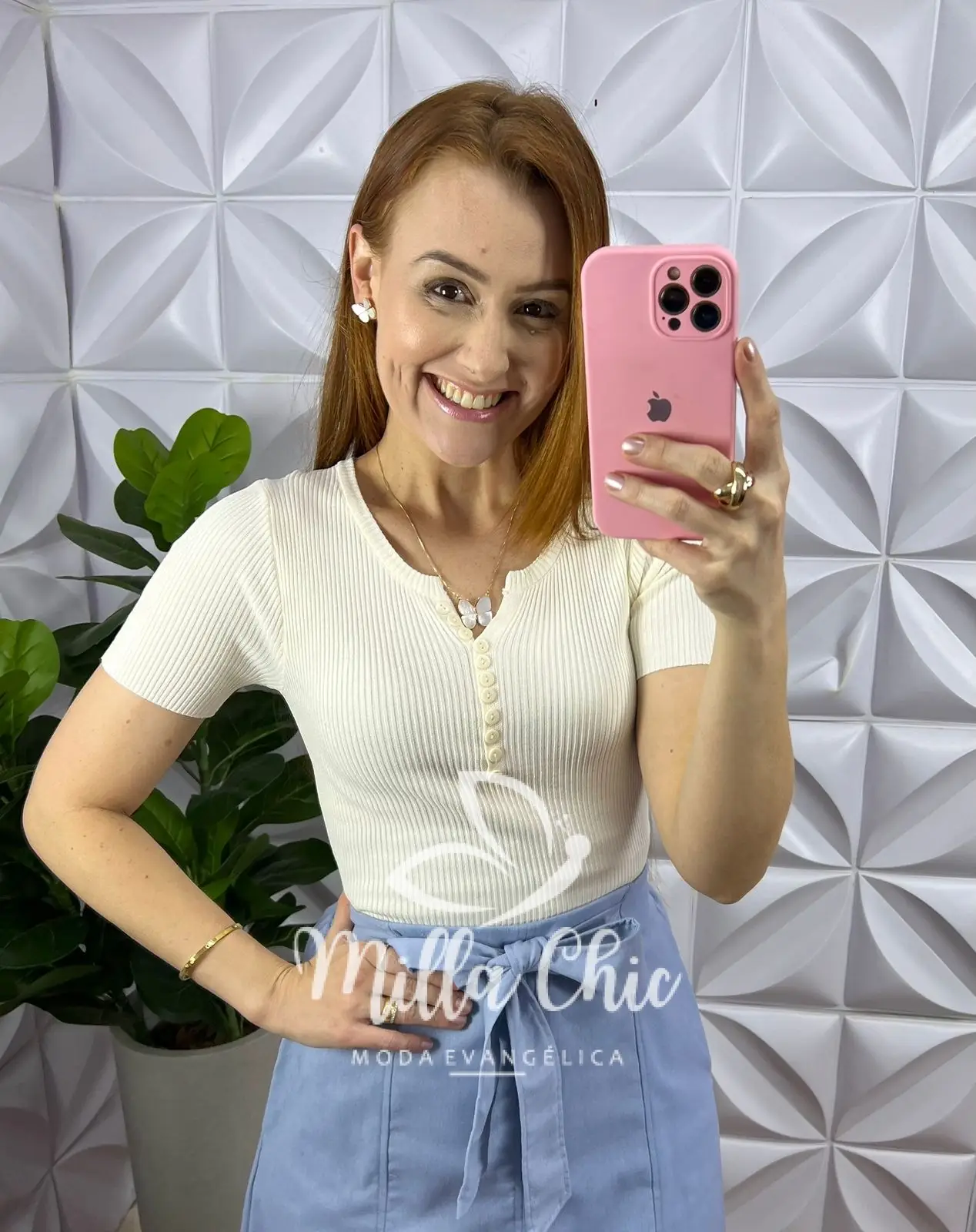 Possui: Manga, Gola redonda com recorte aberto, botões no busto (não funcionais), comprimento ideal.