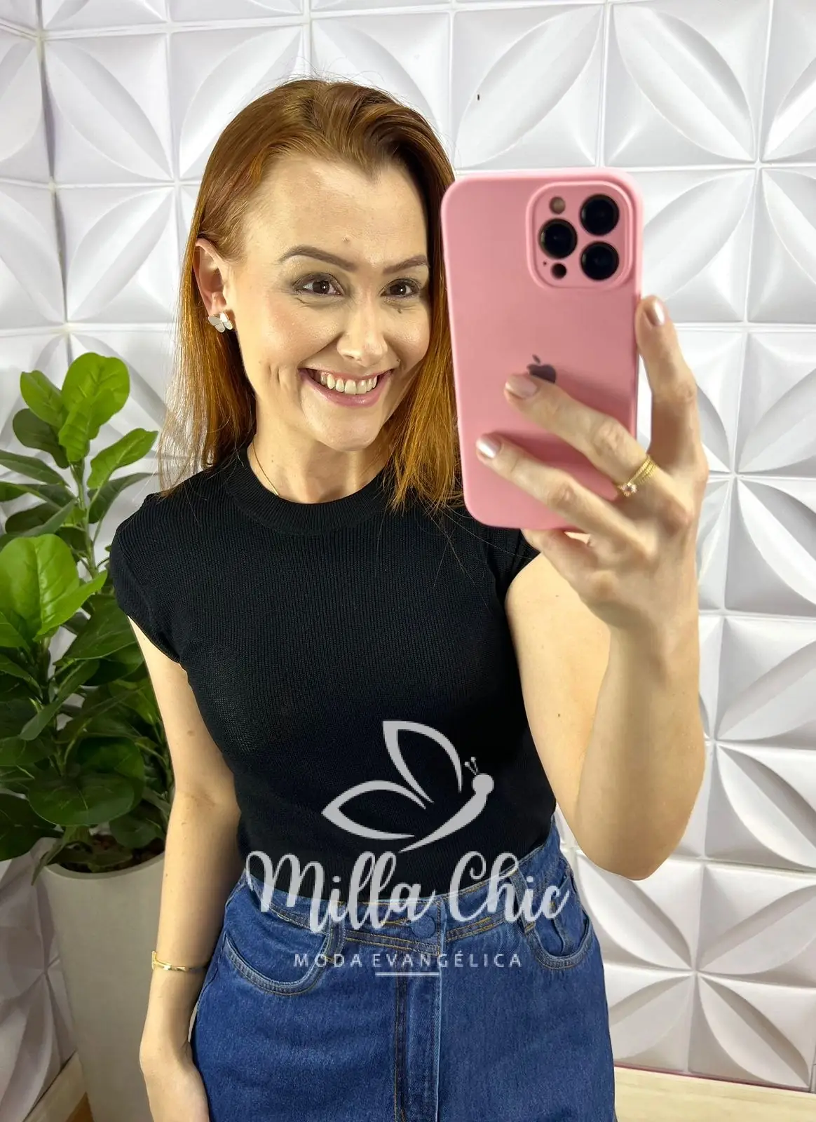 Blusa Tricot Modal Gola Marcada Manga Curta Celeste - Preta - Milla Chic