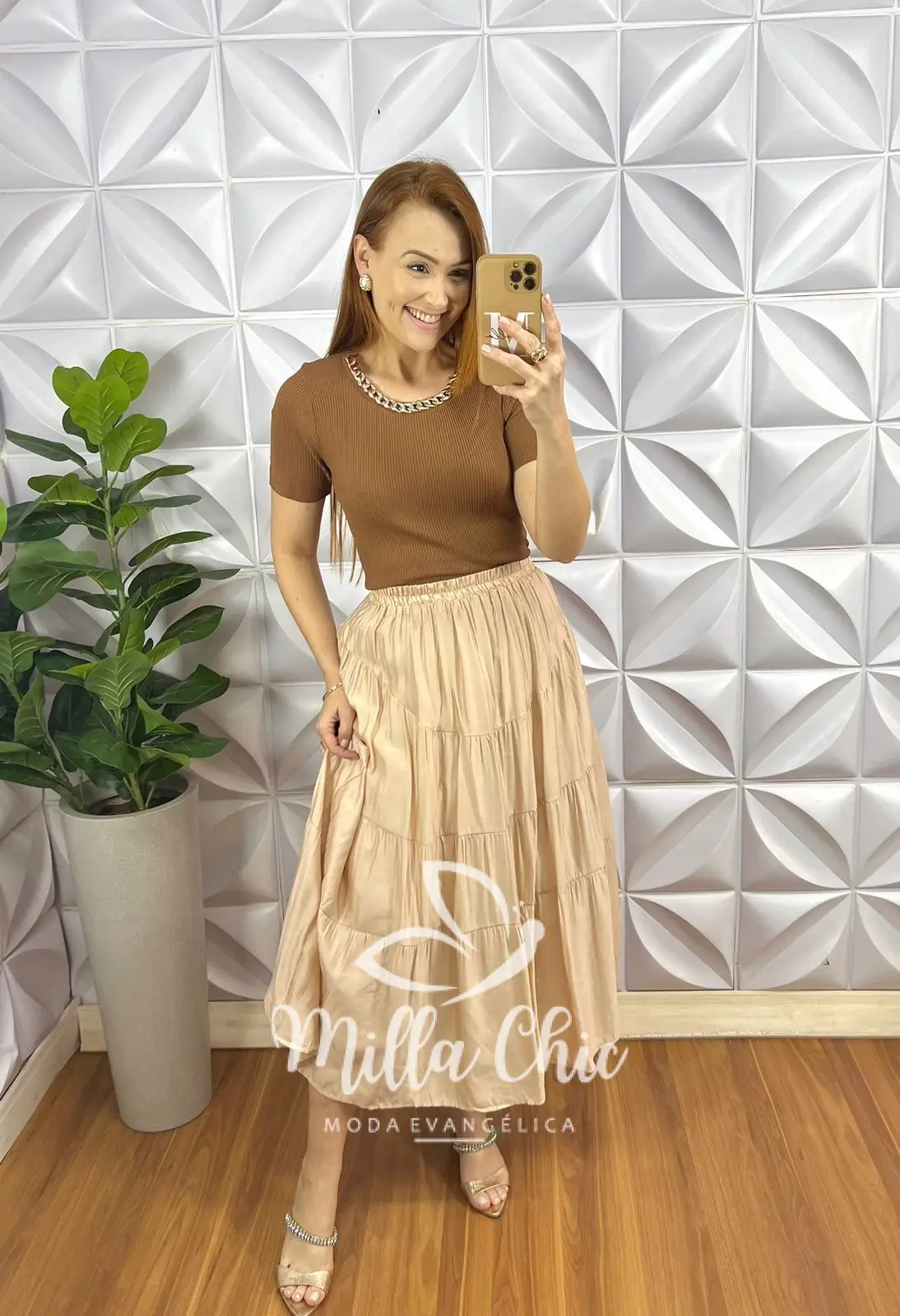 Possui: Manga Justa, Gola U marcada, colar de corrente, estilo cropped com comprimento ideal.