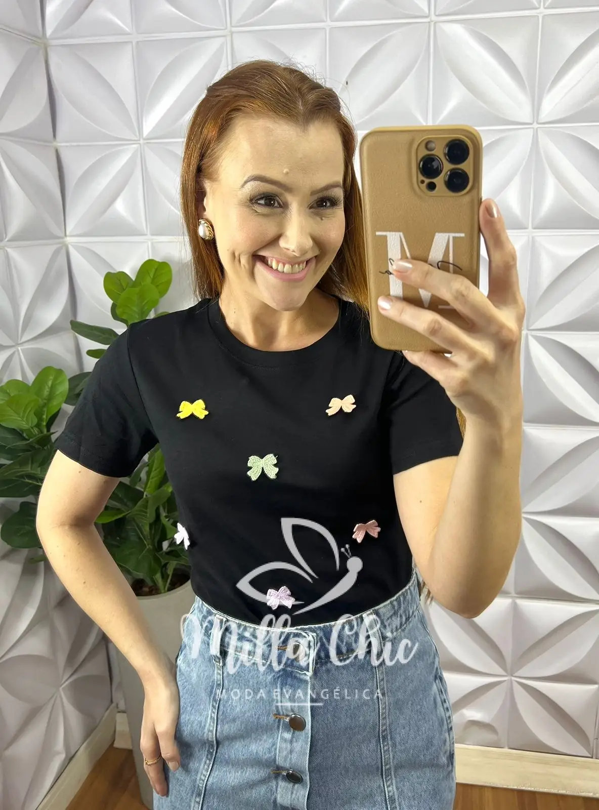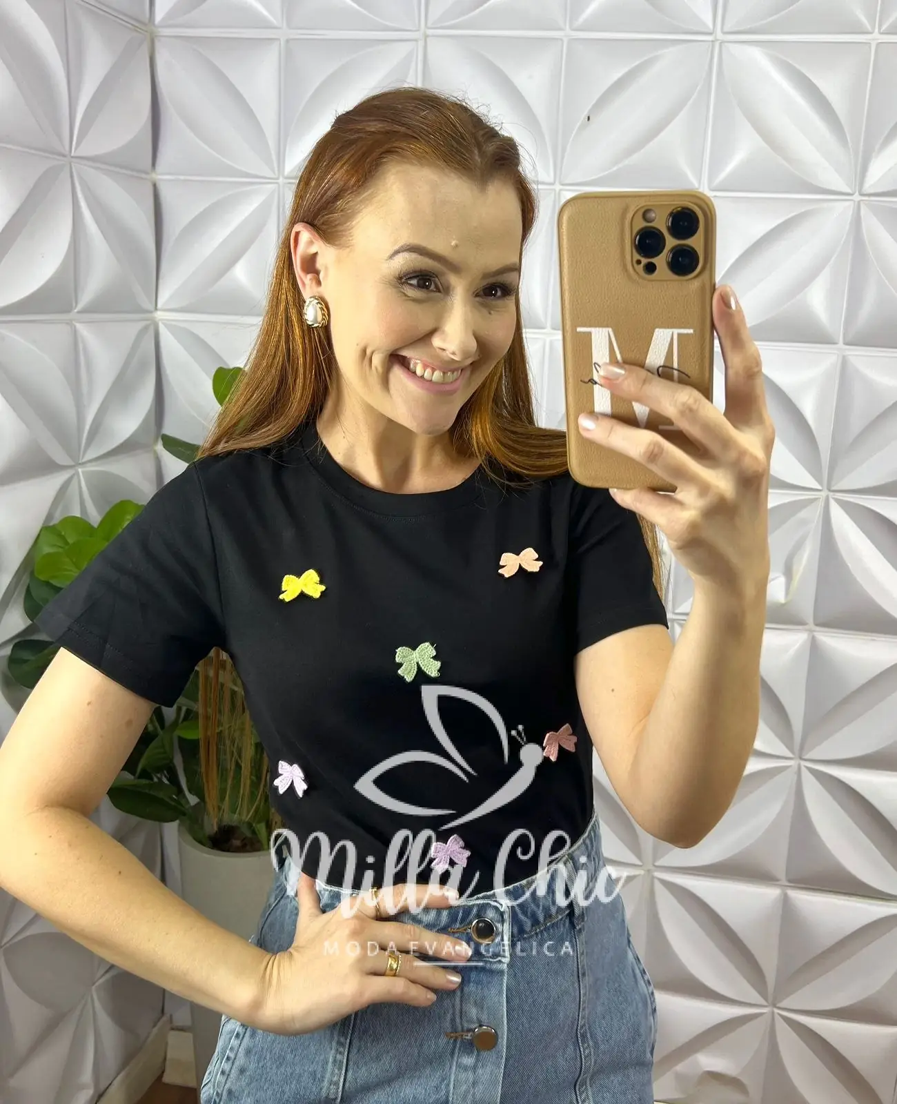 Blusa Tshirt lançamento toda no malha de algodão que está uma delicadeza! Com bordado de laços coloridos que esta um charme super delicada!