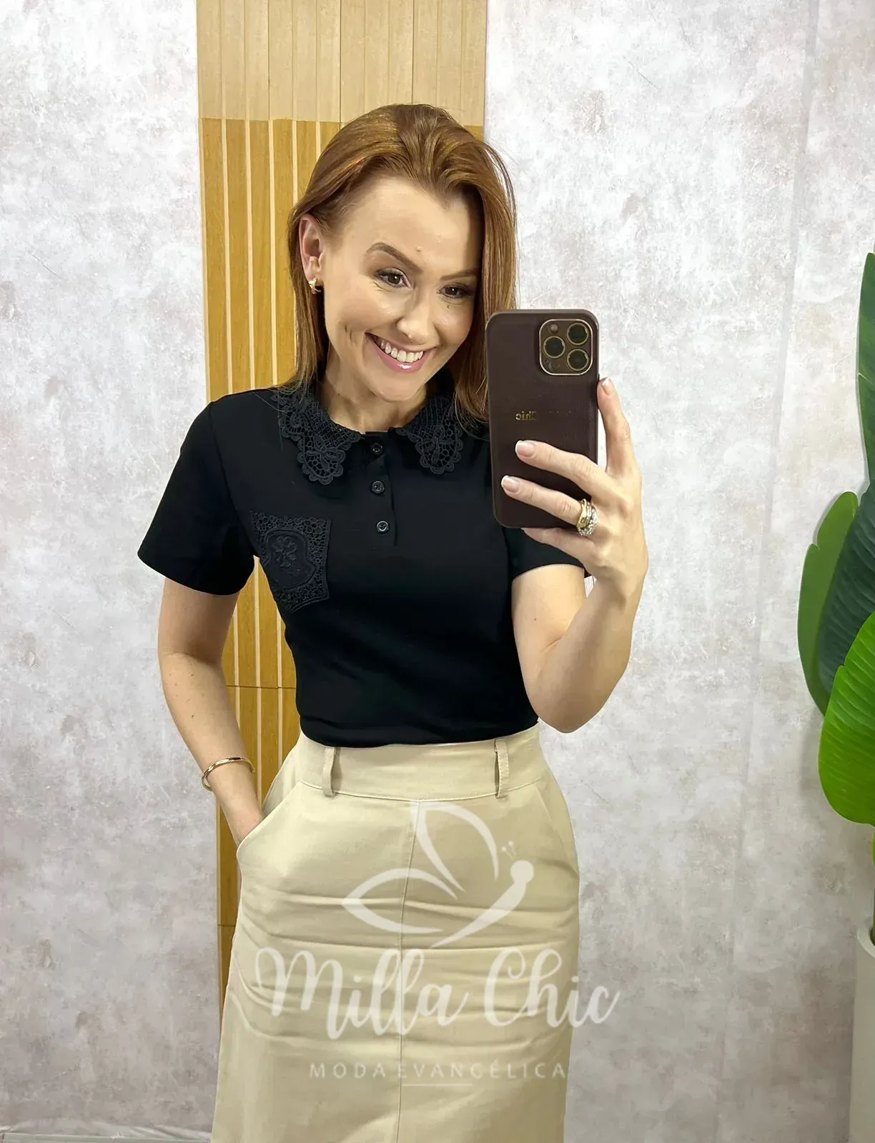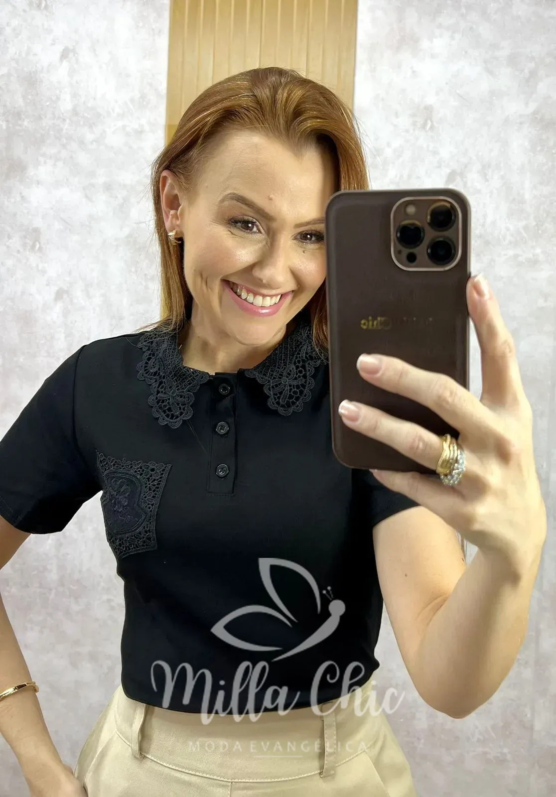 O charme fica por conta da golinha em guipir, que traz um ar romântico e sofisticado, além do bolsinho também em guipir, que adiciona um detalhe exclusivo e diferenciado à peça.