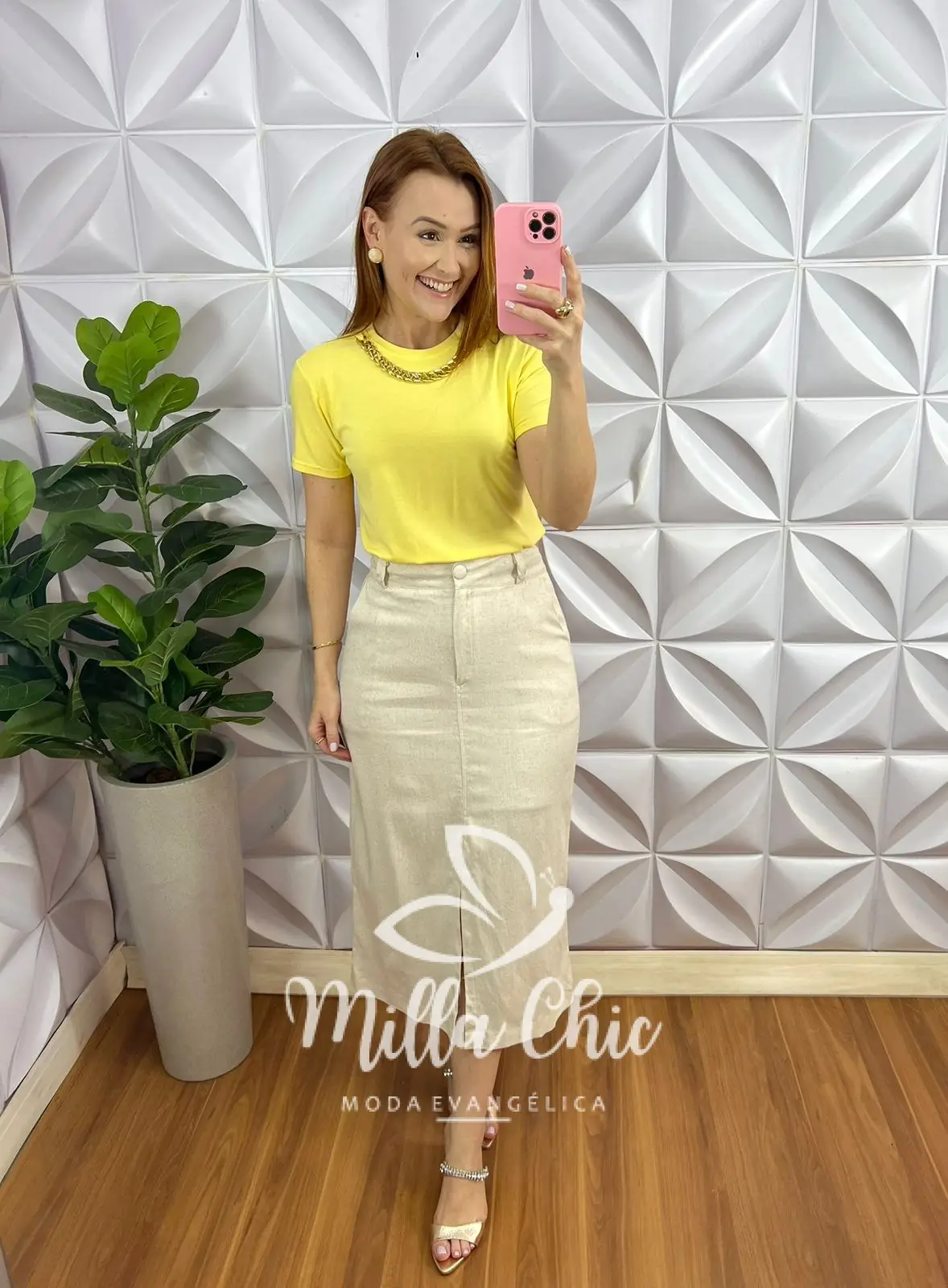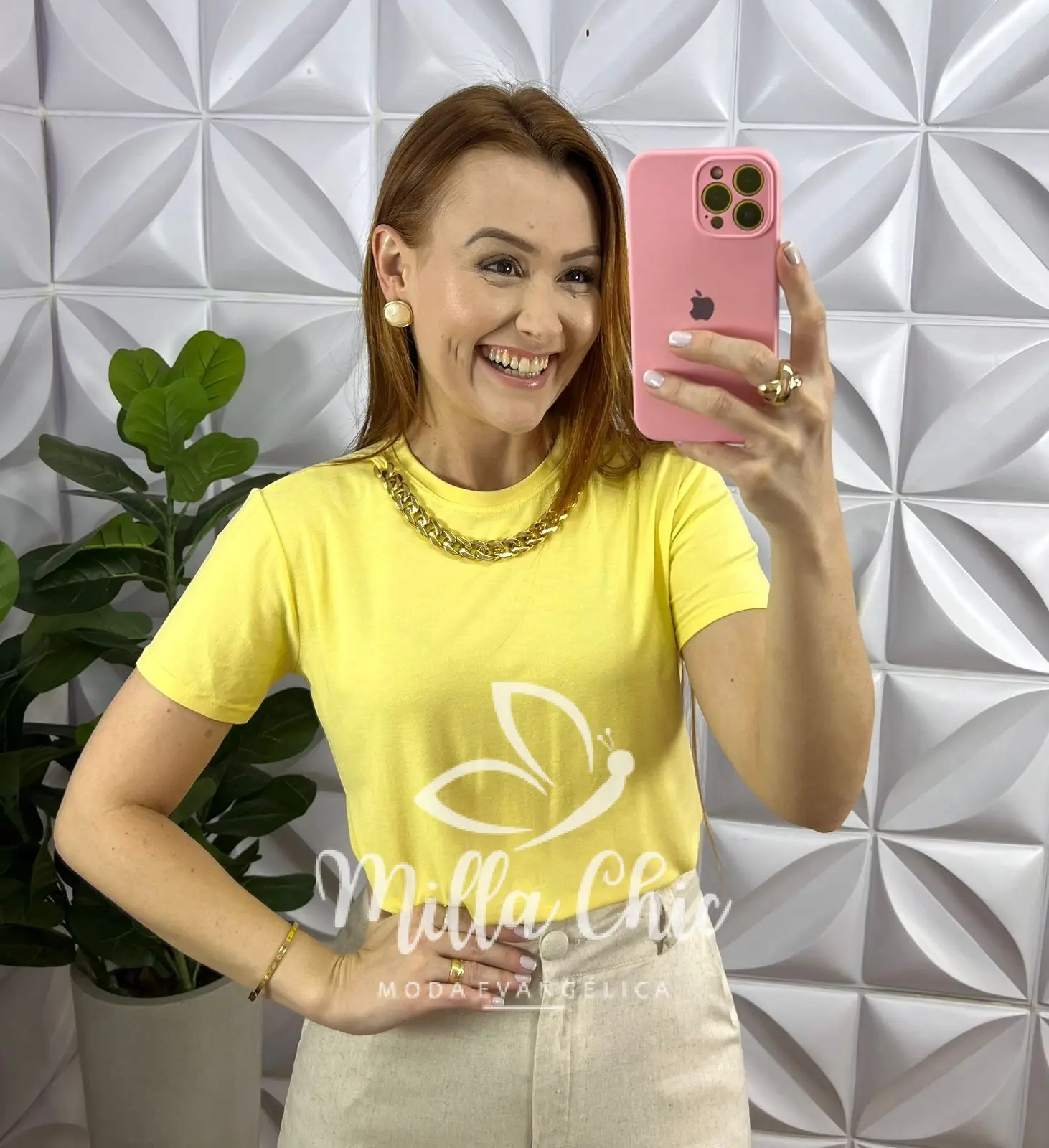Blusa Viscolycra Com Colar Dourado Ana Beatriz - Amarelo - Milla Chic