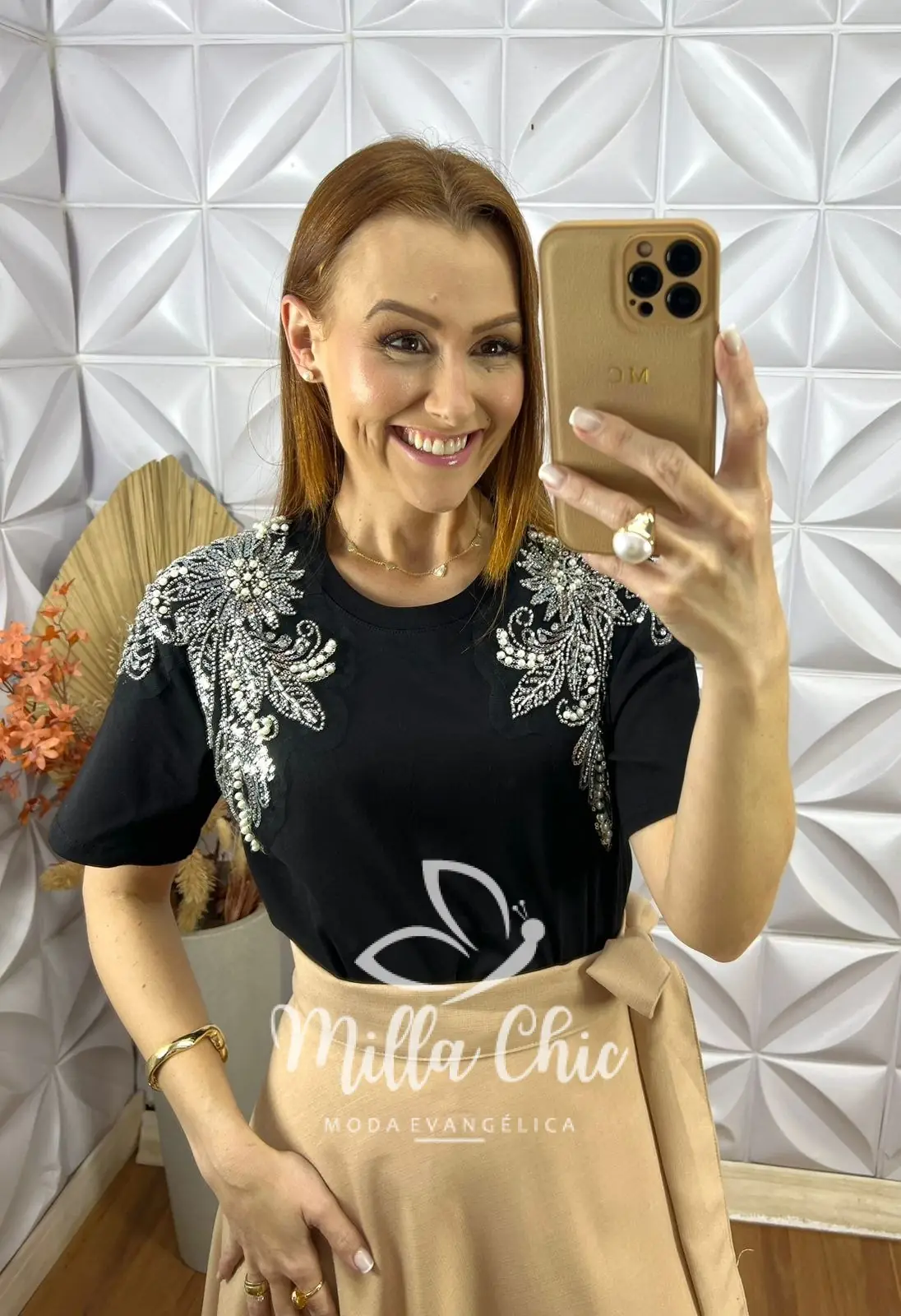 Aquela blusa confortável e estilosa para looks casuais ficarem mais elegantes e sofisticados . Confeccionada em malha 100% algodão . Muito confortável e fresca . E o detalhe que faz toda diferença é o bordado em canutilhos , pérolas e paetes no ombro descendo para a blusa que está um espetáculo de riqueza .