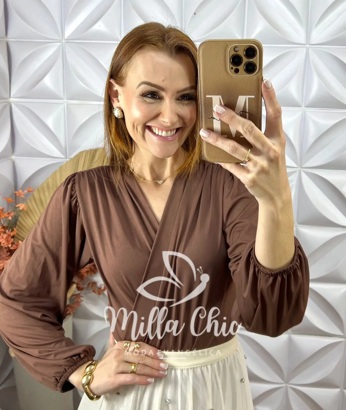 A modelagem em manga longa, com leve franzido no pescoço traz um ar refinado à peça, que transita com facilidade entre produções casuais e sofisticadas. Conta ainda com fecho em colchete e elástico na parte inferior, facilitando o vestir e ajustando perfeitamente à silhueta.