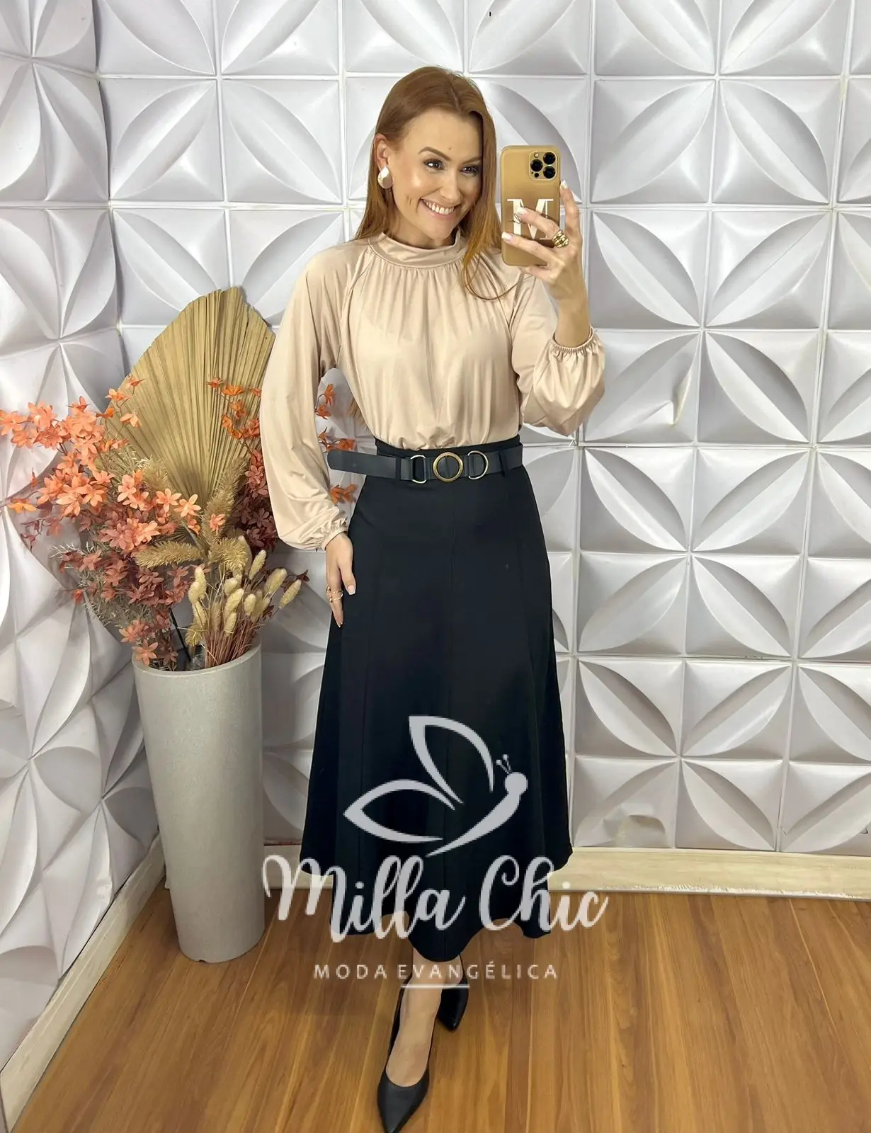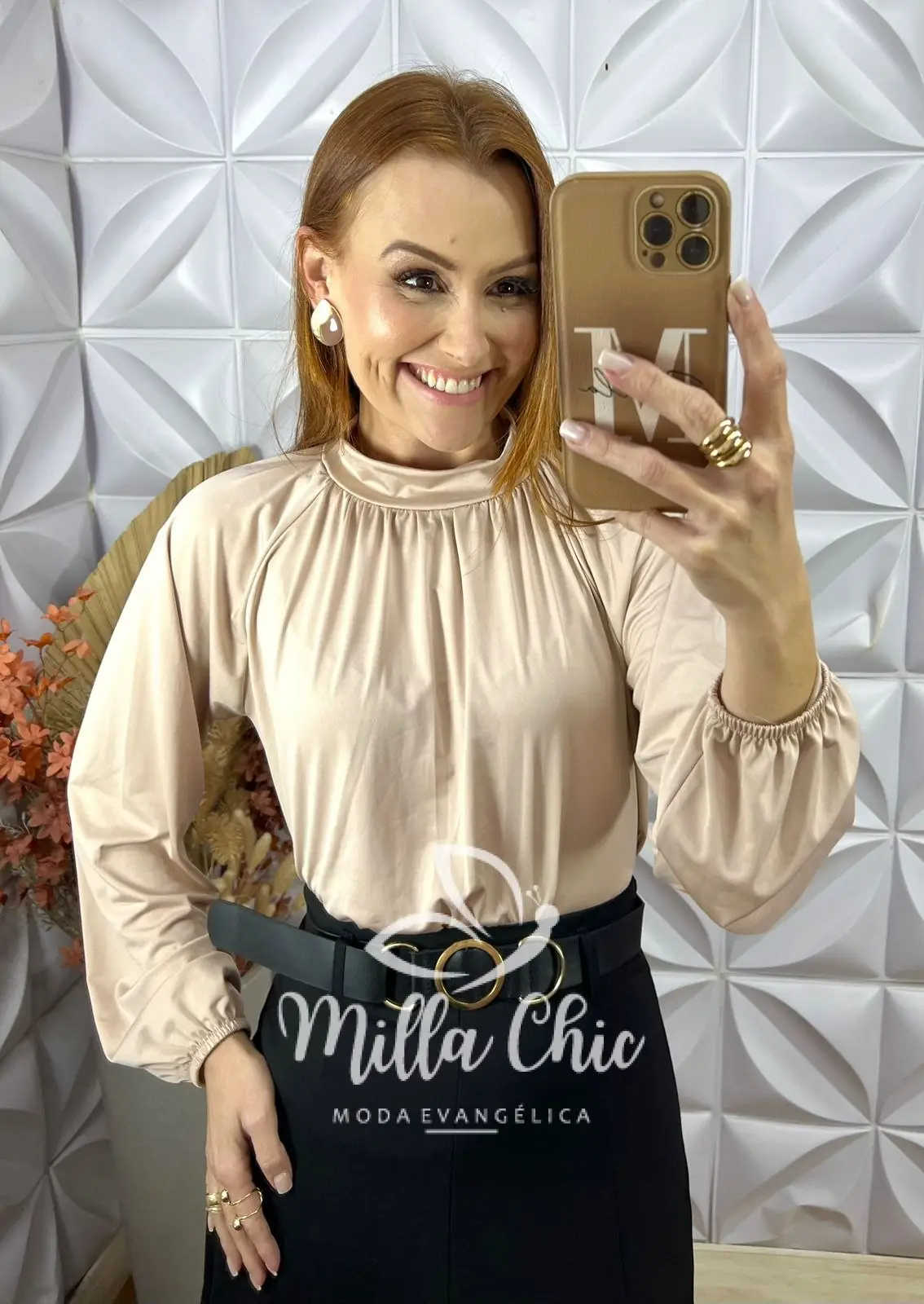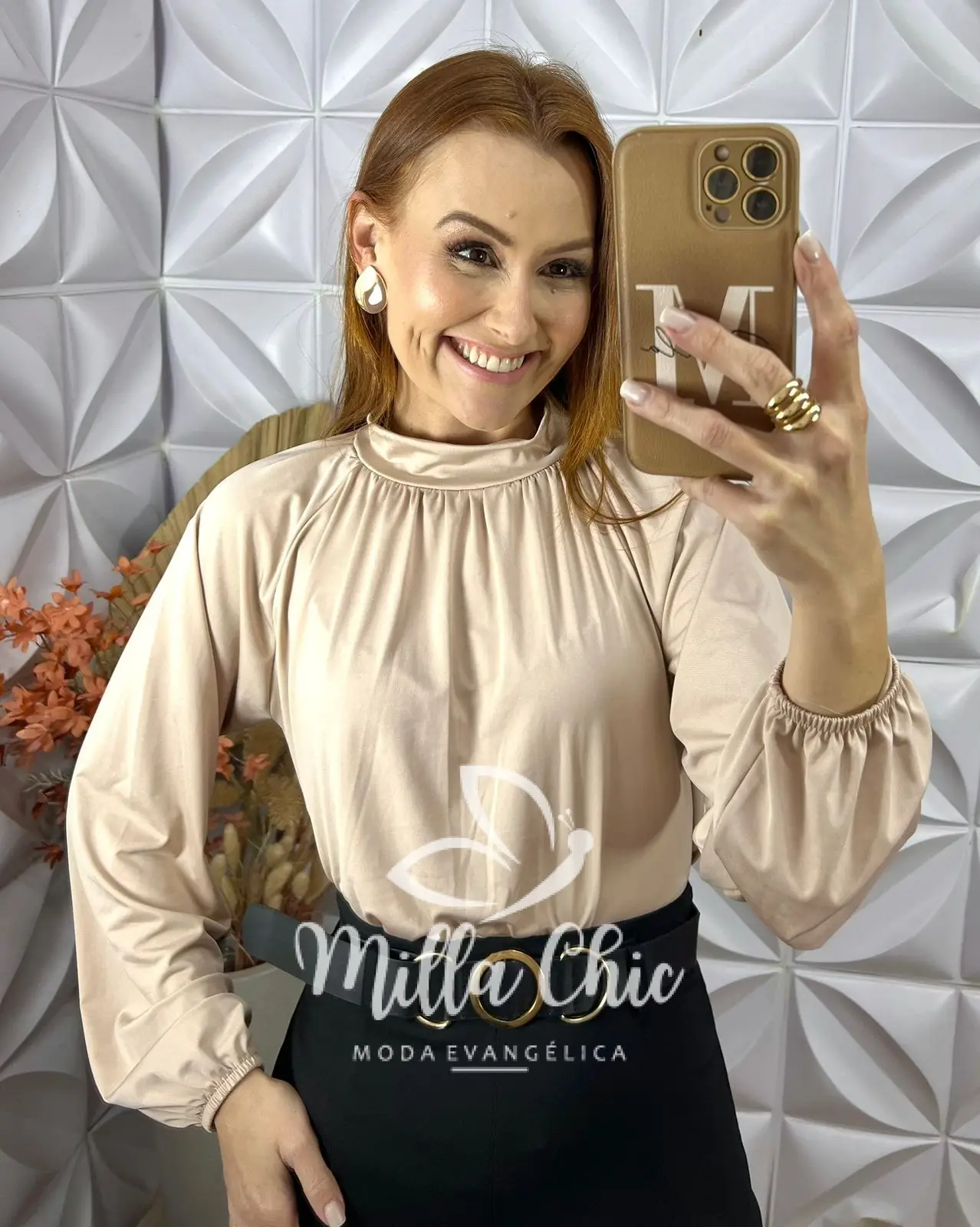 A modelagem em manga longa, com leve franzido no pescoço traz um ar refinado à peça, que transita com facilidade entre produções casuais e sofisticadas. Conta ainda com fecho em colchete e elástico na parte inferior, facilitando o vestir e ajustando perfeitamente à silhueta.