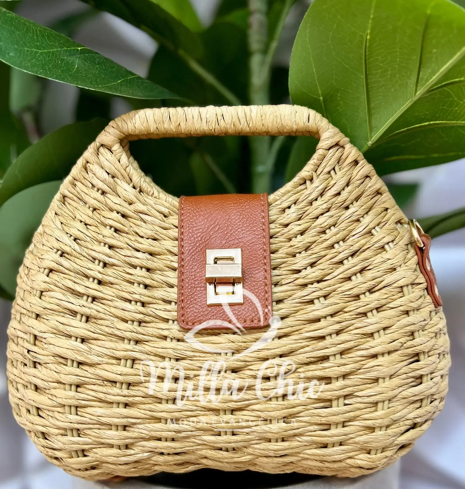 Possui: alça firme de palha, com cordão de palha torcido, fecho de metal dourado.