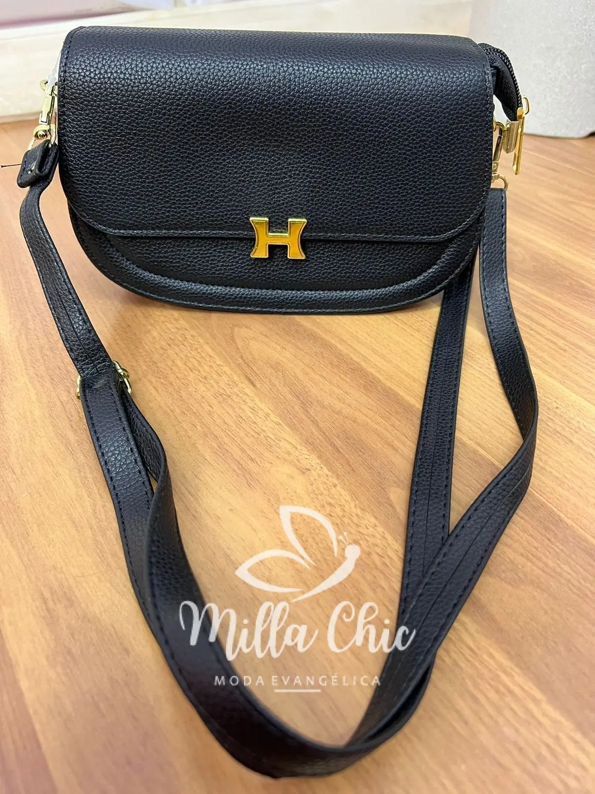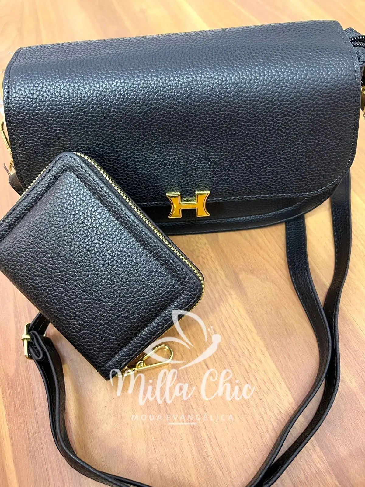 Possui: alça para usar transversal ou lateral, Com fecho dourado H que esta um charme! com imã para fechar, zíper por dentro, com tamanho ideal. Acompanha carteira.
