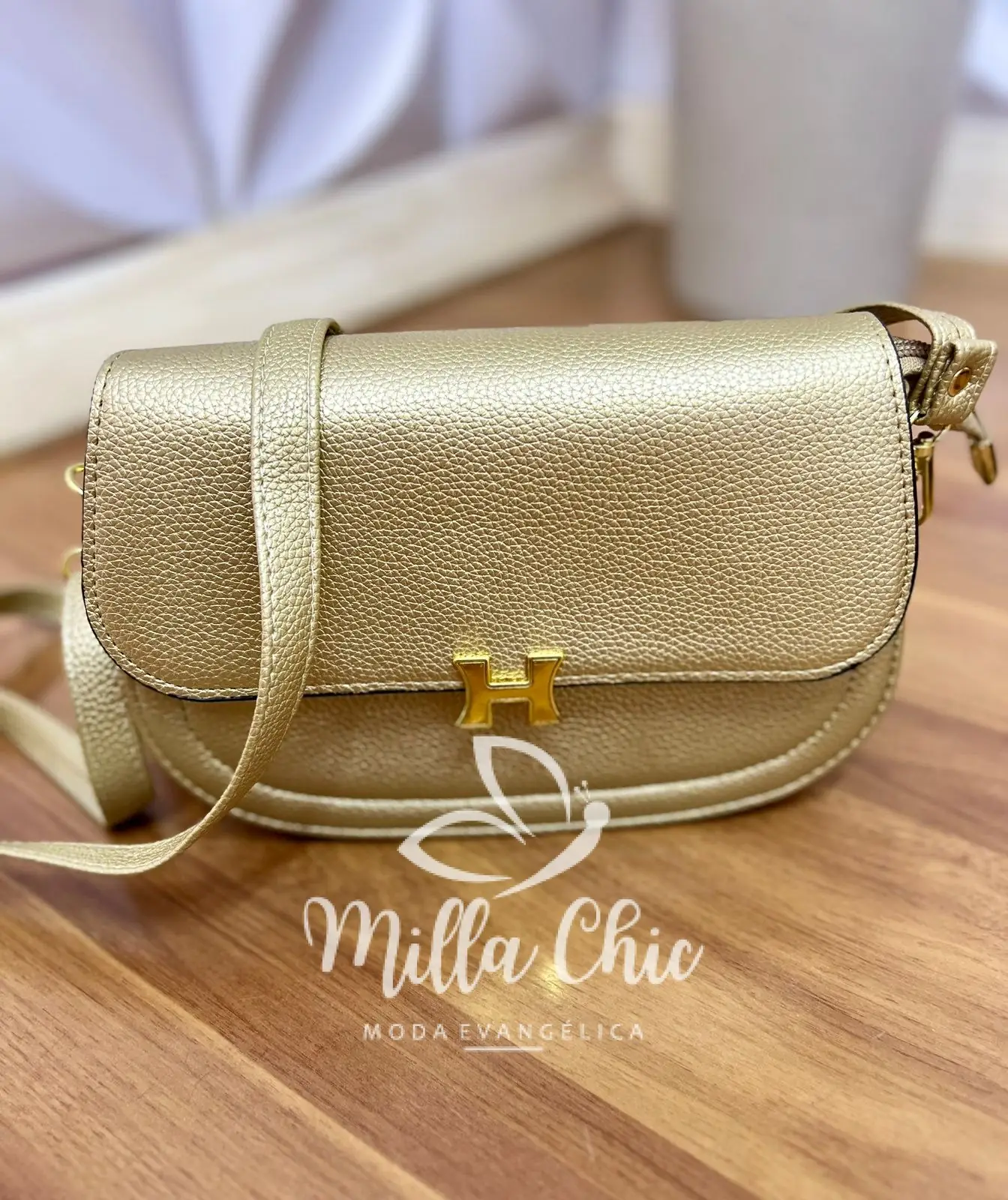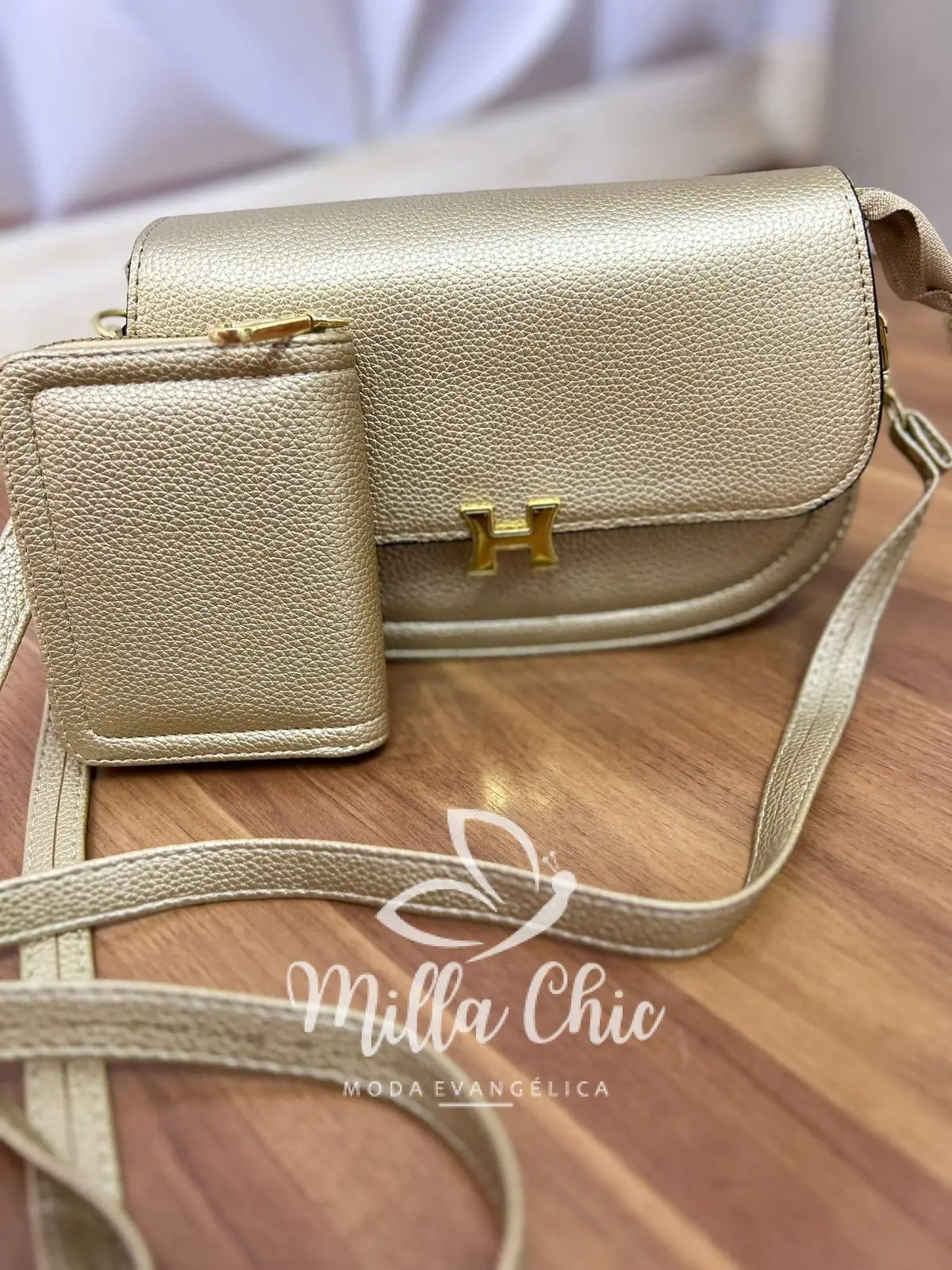 Possui: alça para usar transversal ou lateral, Com fecho dourado H que esta um charme! com imã para fechar,  zíper por dentro, com tamanho ideal. Acompanha carteira.