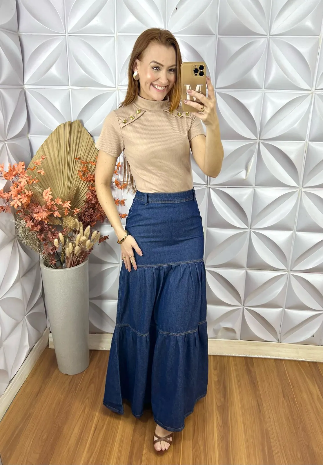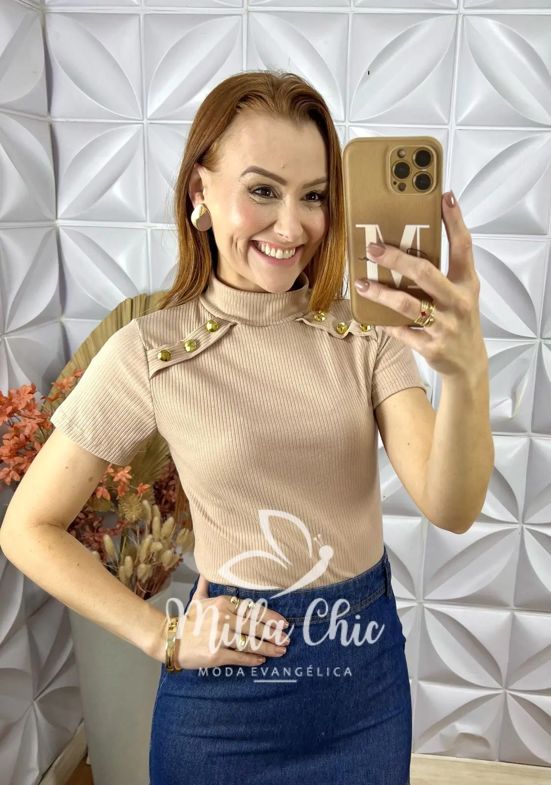 Com comprimento no quadril, proporciona um caimento perfeito e versatilidade para ser combinada com diferentes peças. O detalhe que deixa ela mais sofisticada é o Drapeado com botões dourados no ombro .