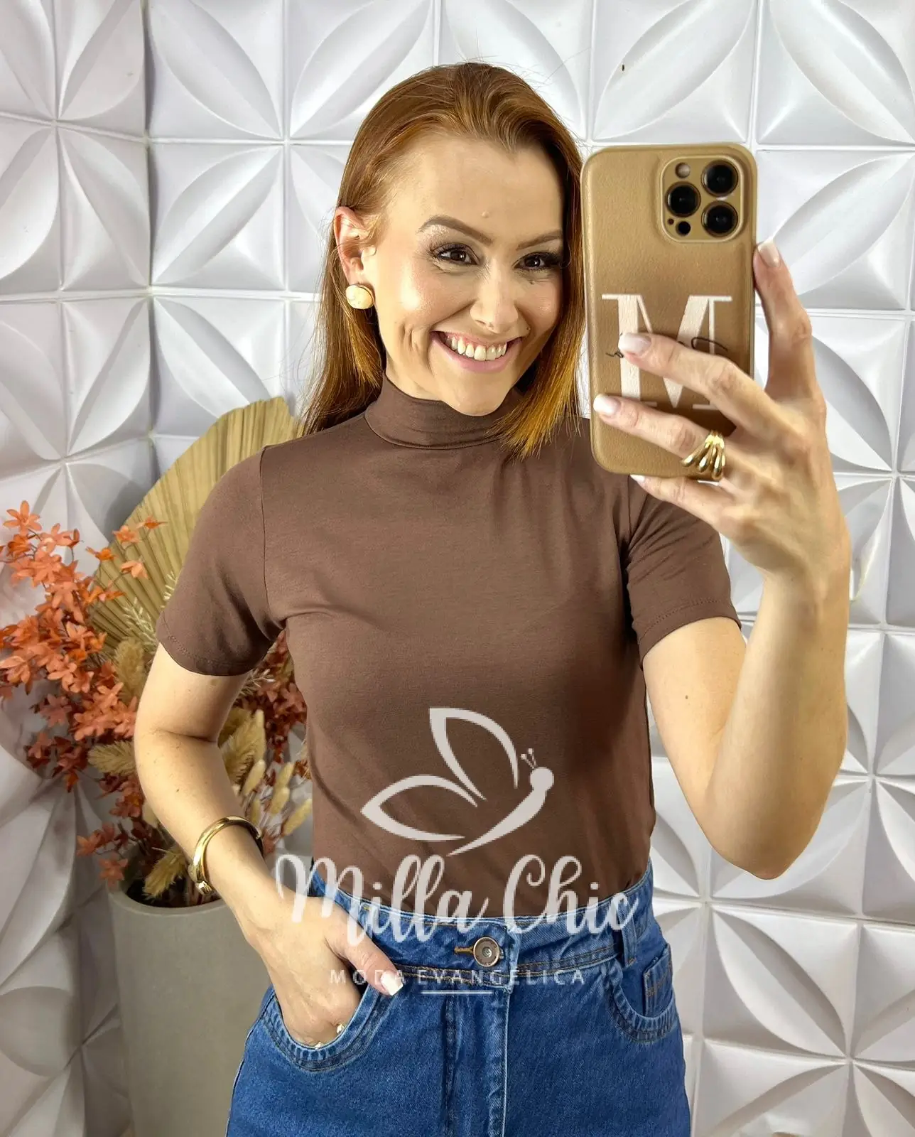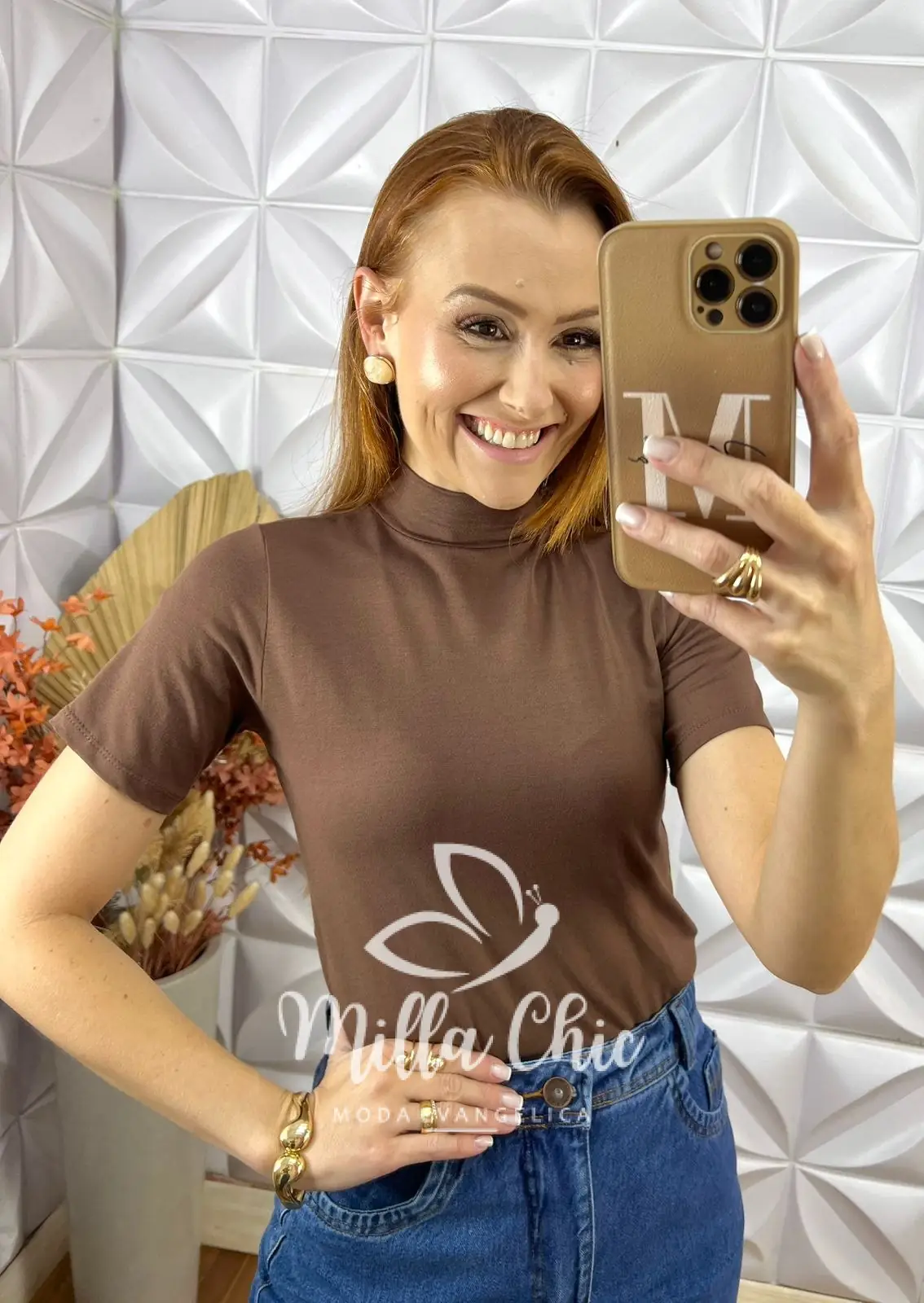 Ela possui uma modelagem justa e a gola alta que passa uma elegância e alonga .