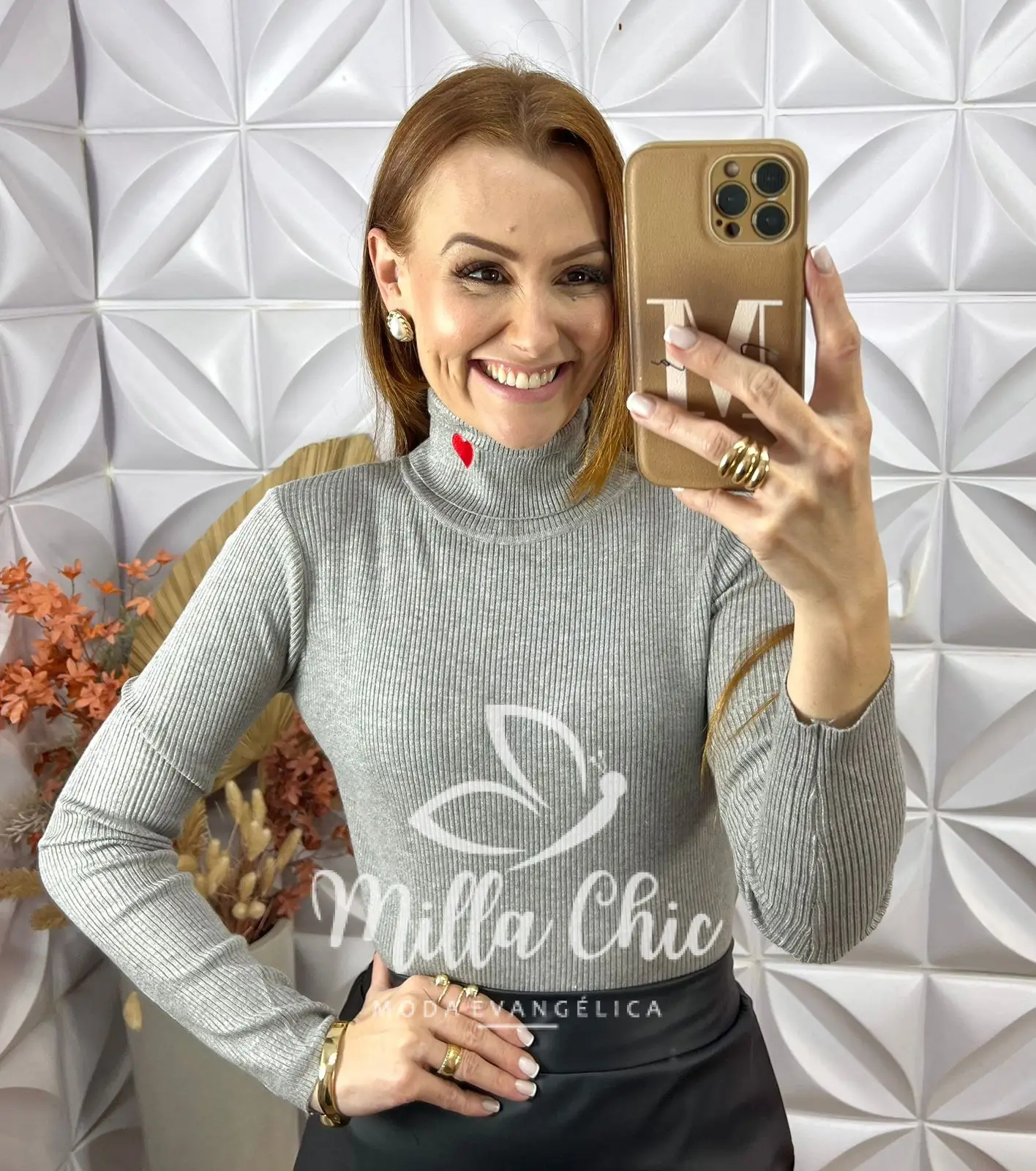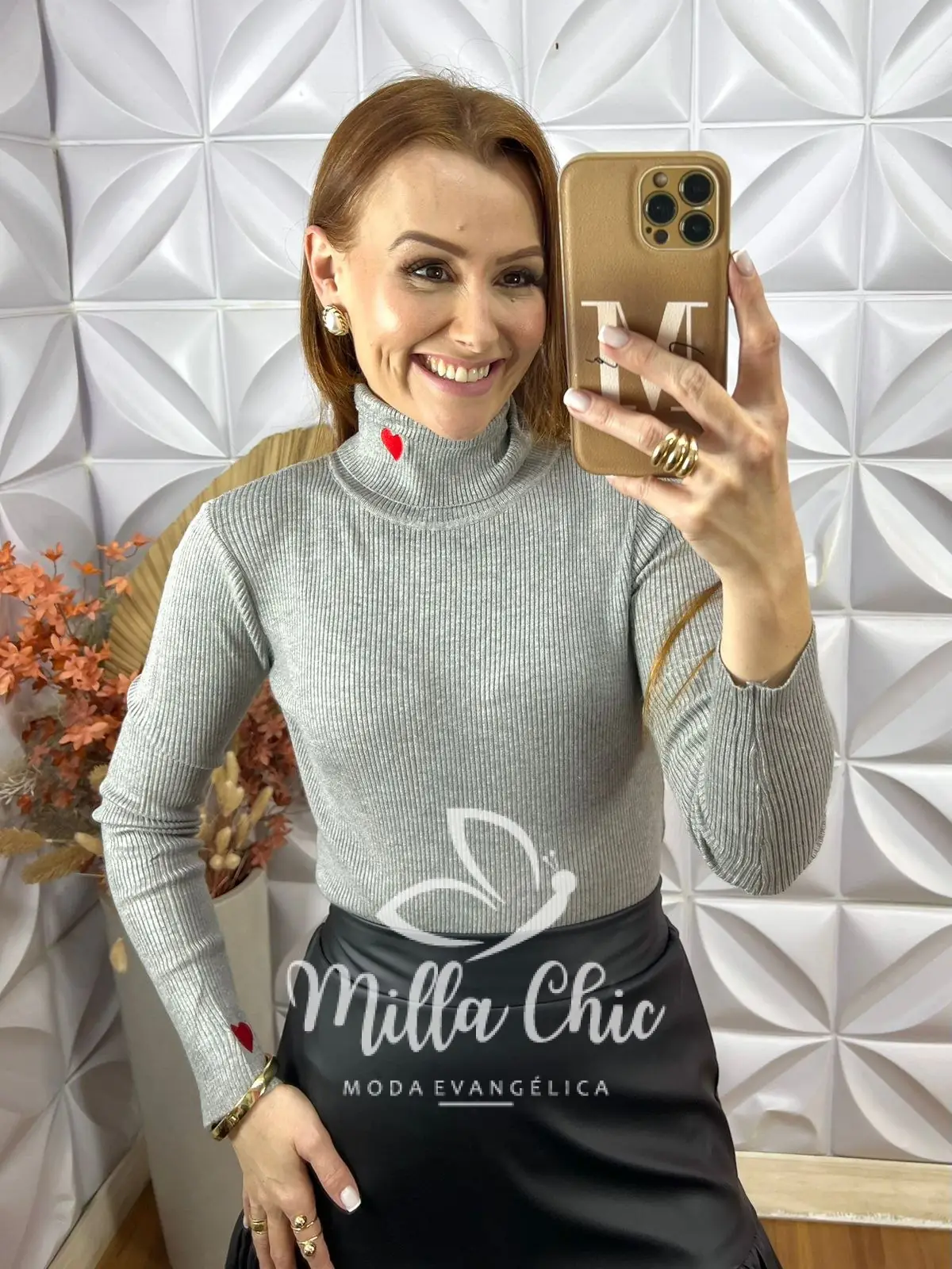 Ela possui uma modelagem justa e a gola alta que passa uma elegância e alonga .