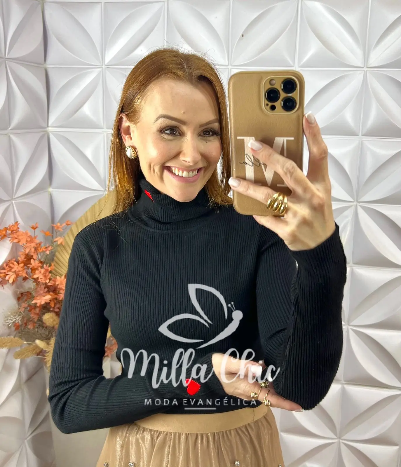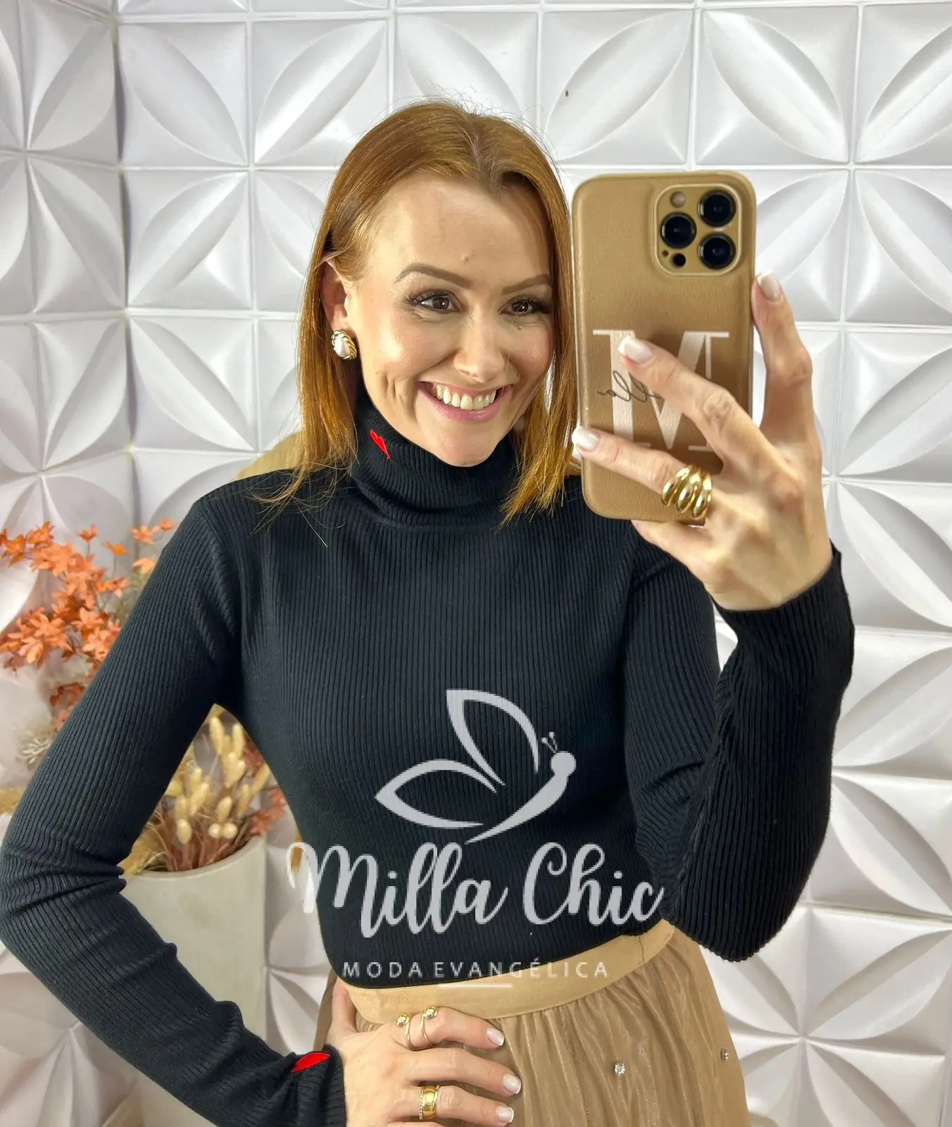 Ela possui uma modelagem justa e a gola alta que passa uma elegância e alonga .