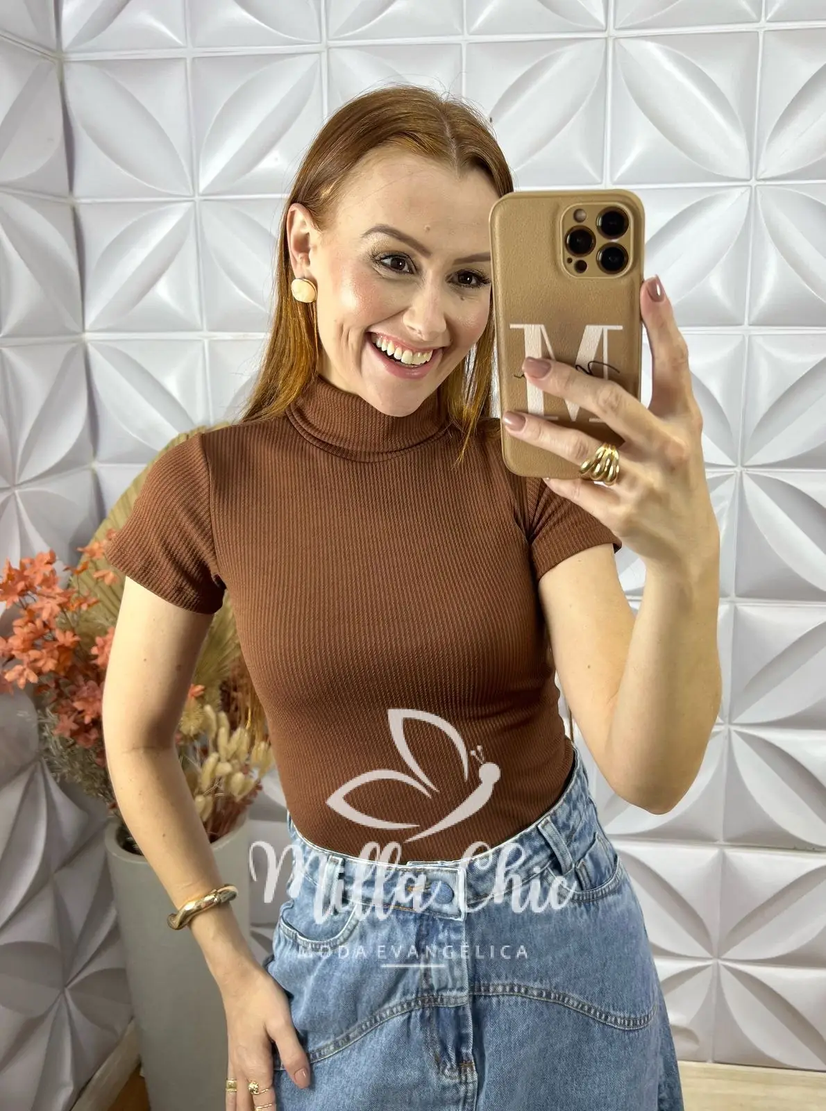 Ela possui uma modelagem justa e a gola alta que passa uma elegância e alonga .
