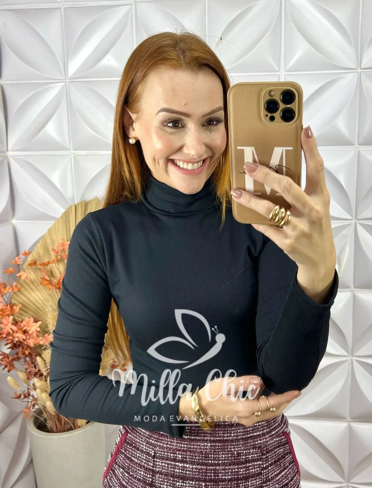Ela possui uma modelagem justa e a gola careca que passa uma elegância.