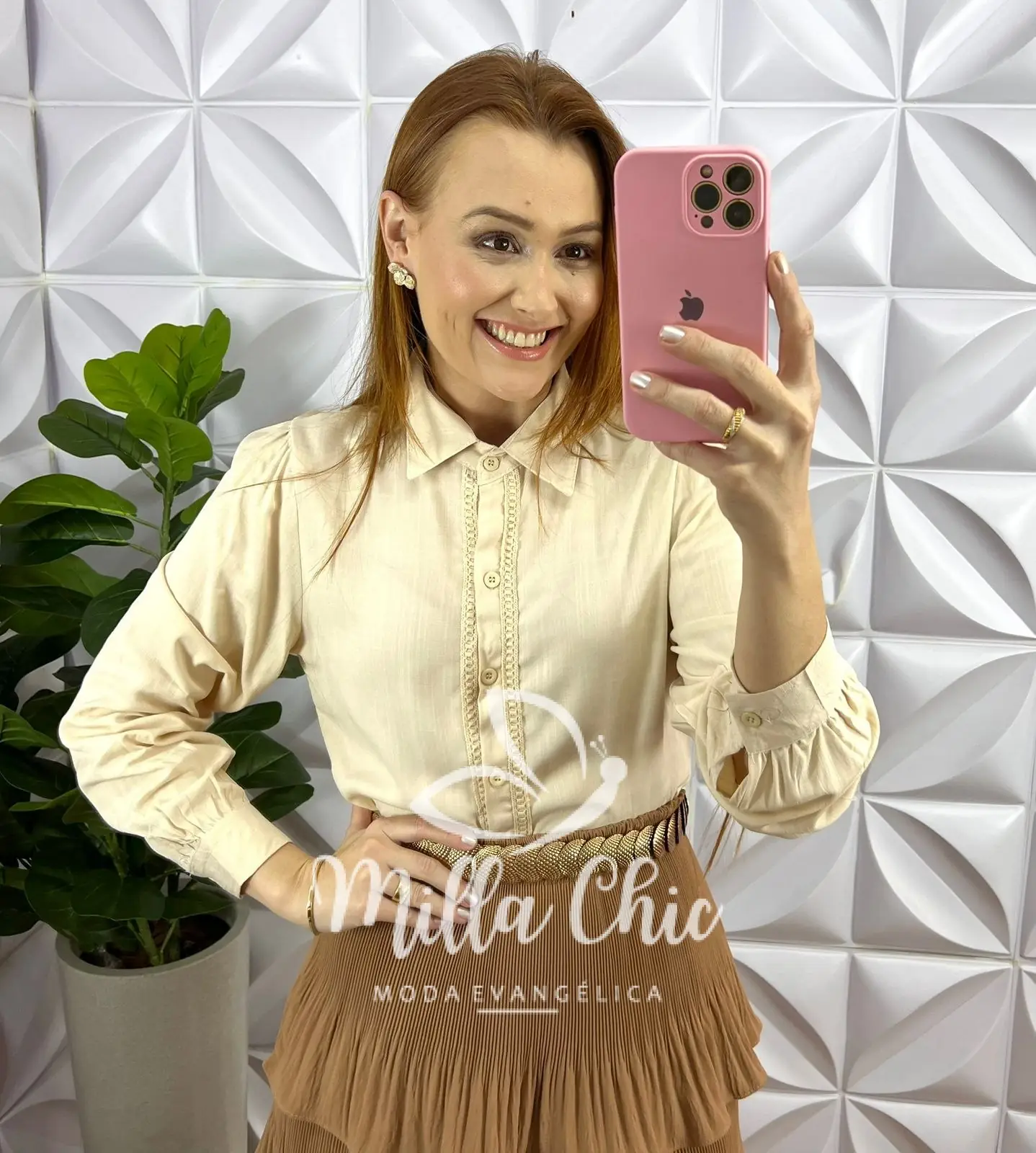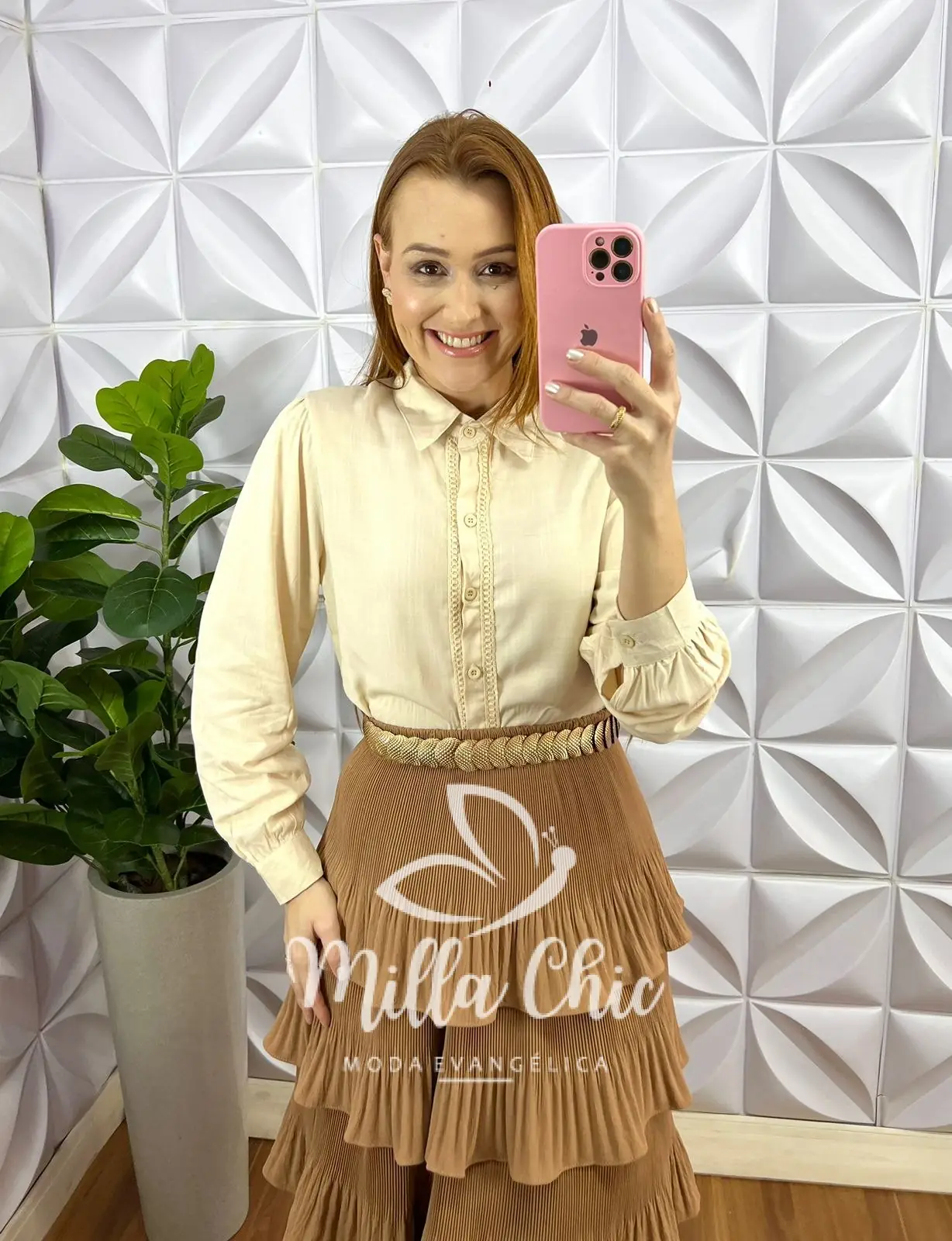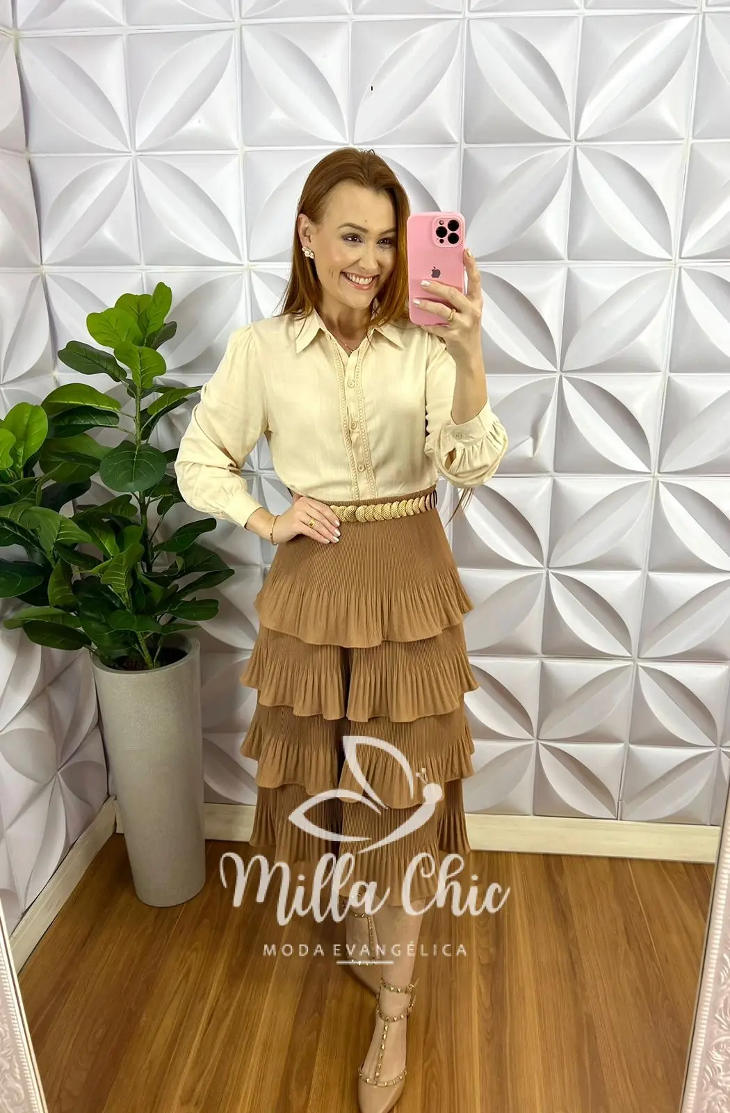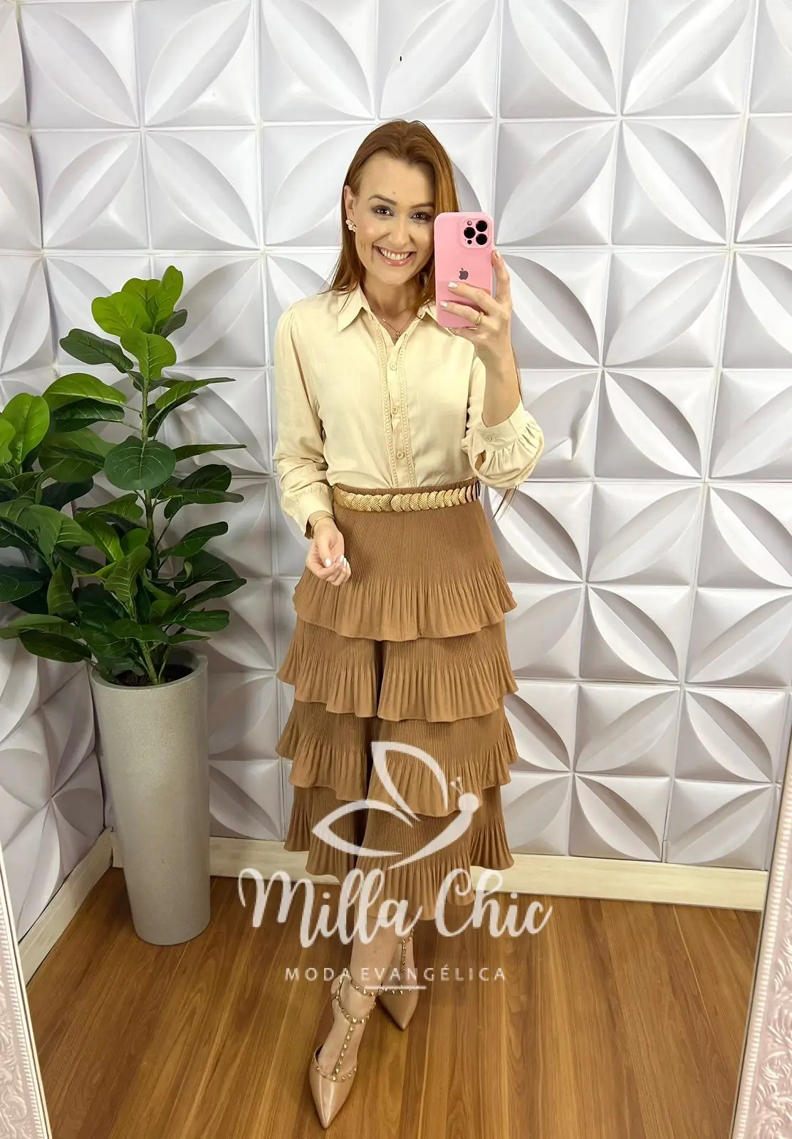 Saia Dunna Plissada Com Camadas Mídi Anylara - Areia - Milla Chic