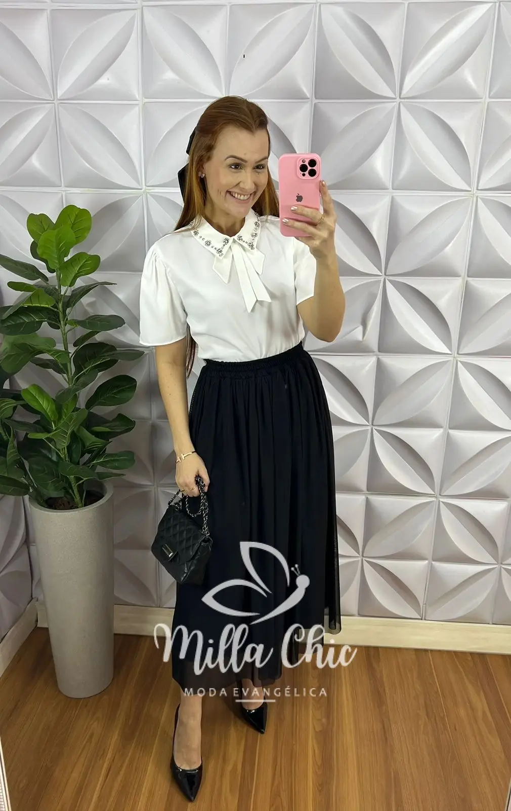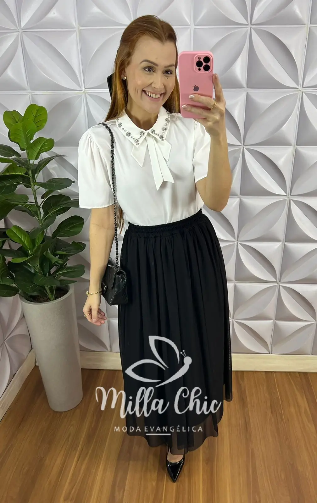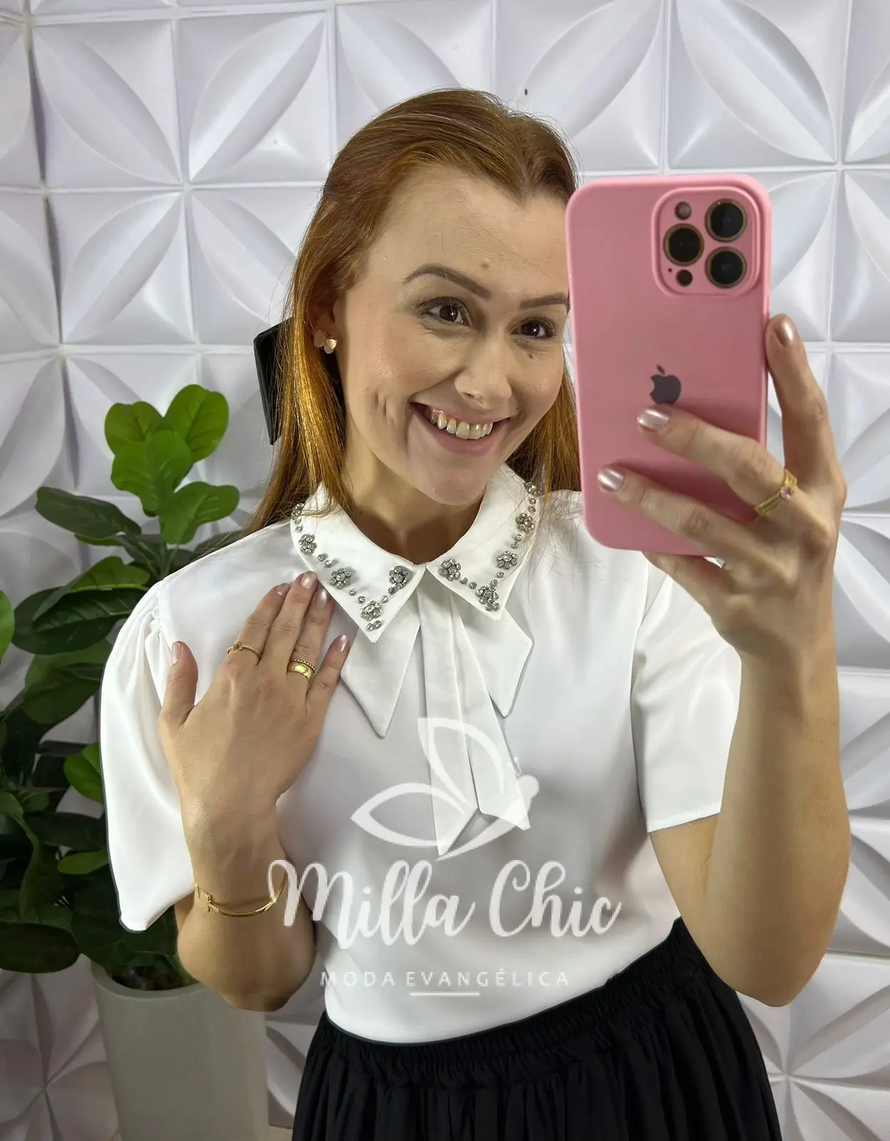 Camisa lançamento toda no tecido Crepe de Seda com bordado na gola de Strass que está uma delicadeza!
