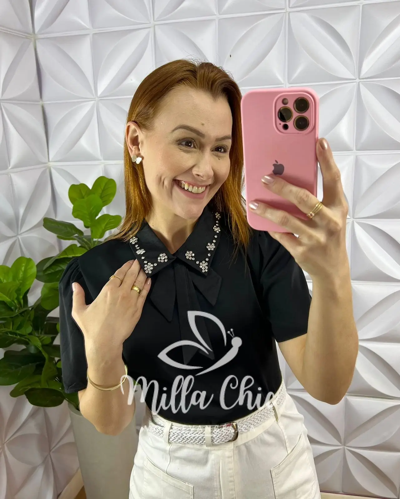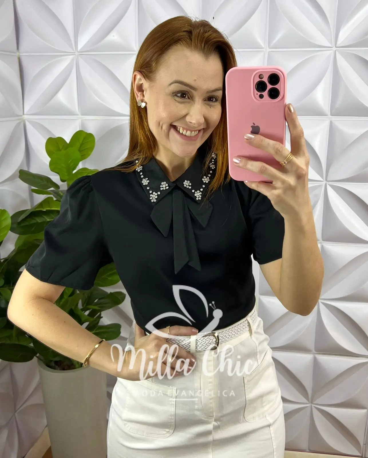Camisa lançamento toda no tecido Crepe de Seda com bordado na gola de Strass que está uma delicadeza!