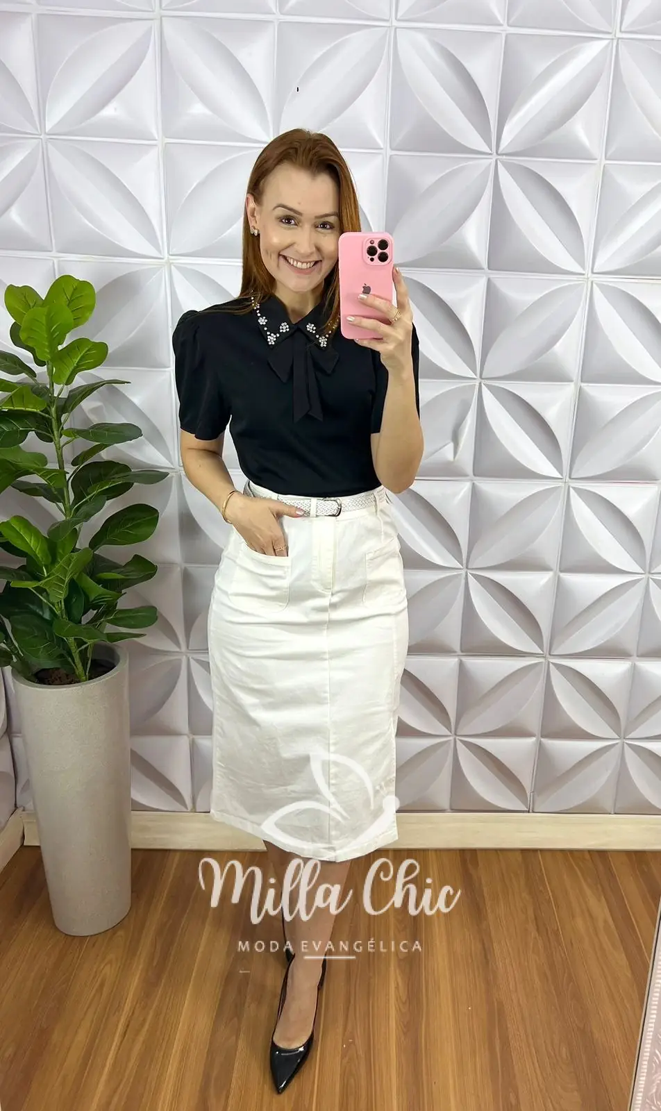 Saia Sarja Com Elastano Com Fenda E Bolsos Laterais Com Cinto Tamires - Branca - Milla Chic