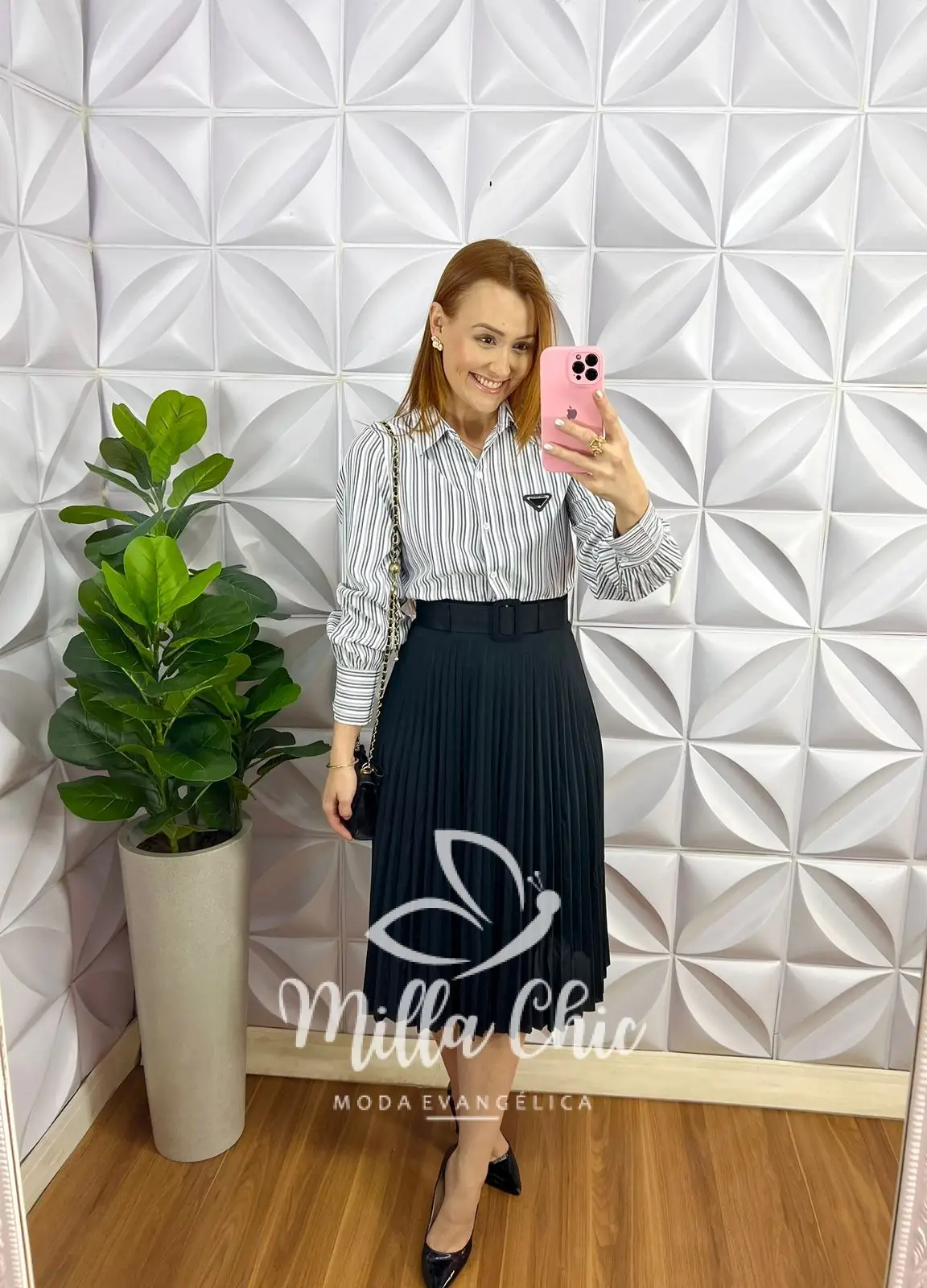 Camisa de Tricoline Listrada Plaquinha Bordada Patrícia - Preta - Milla Chic