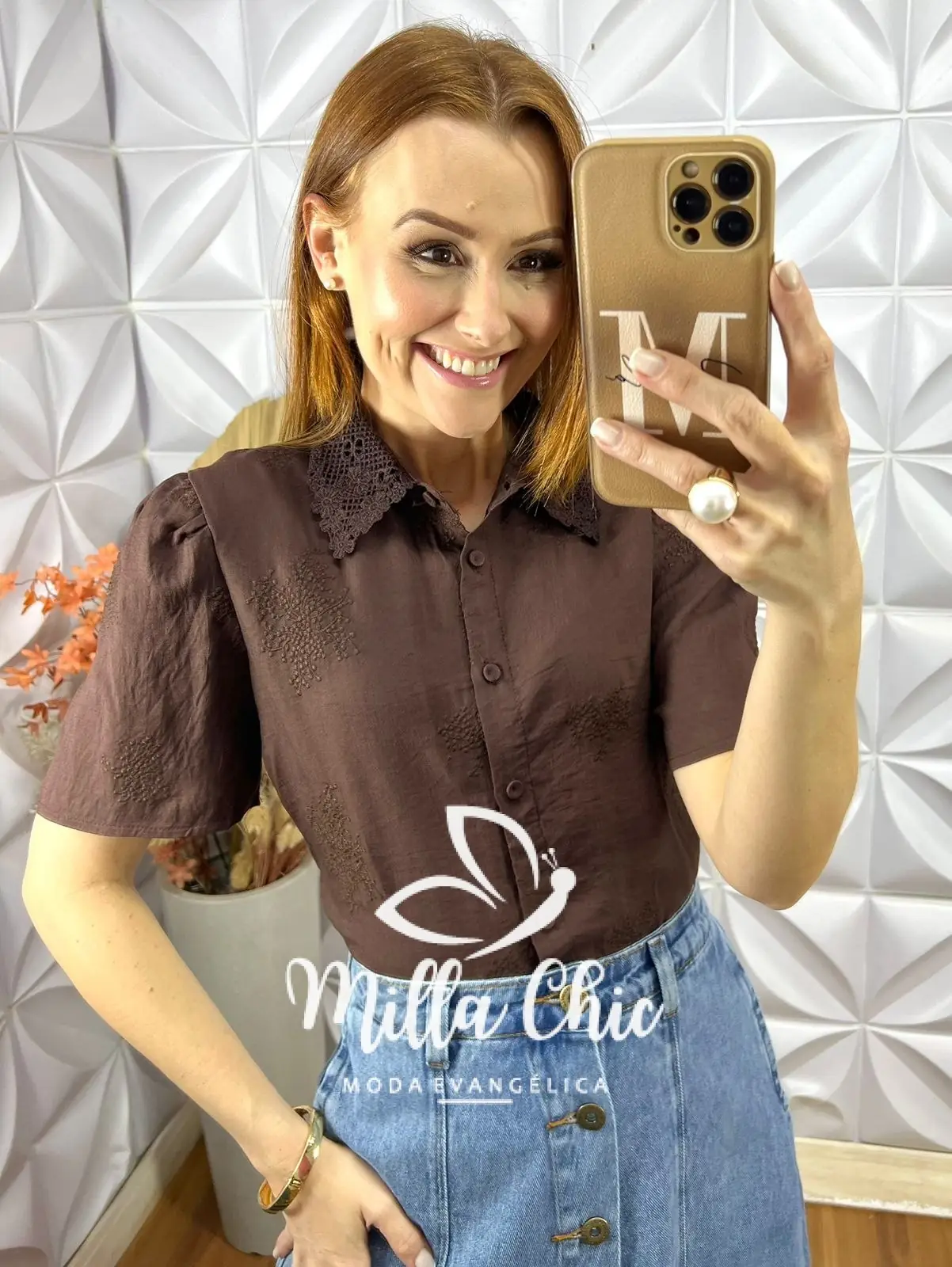 Camisa Domênica Gola Guipper - Marrom - Milla Chic