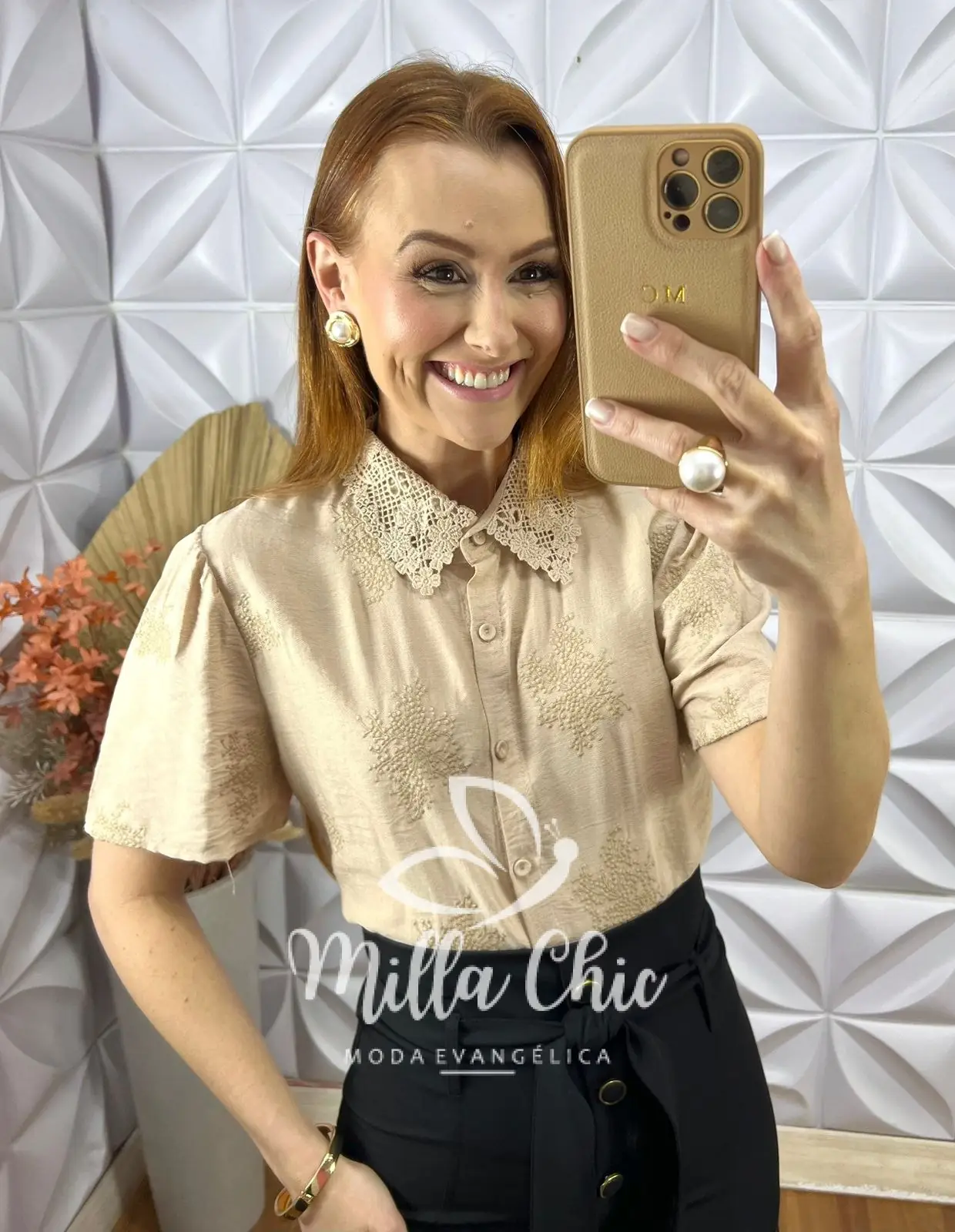 Toda confeccionada no tecido viscoamida . Um tecido novo que não precisa passar , leve , fresco e confortável . Esse tecido tem um leve acetinado . E o diferencial dessa camisa saia os bordados da mesma cor do tecido o que deixa ela mais sofisticada .