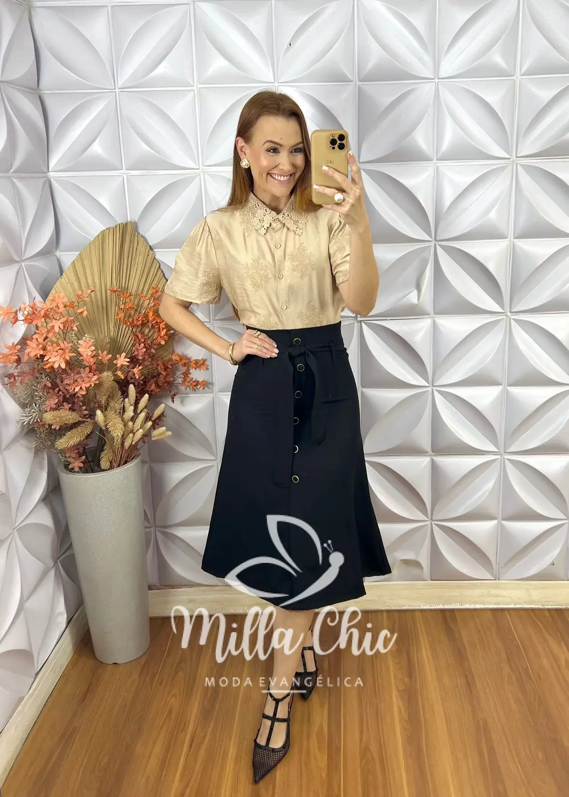 Botões funcionais e encapados a camisa Domênica vai deixar o seu look mais lindo .