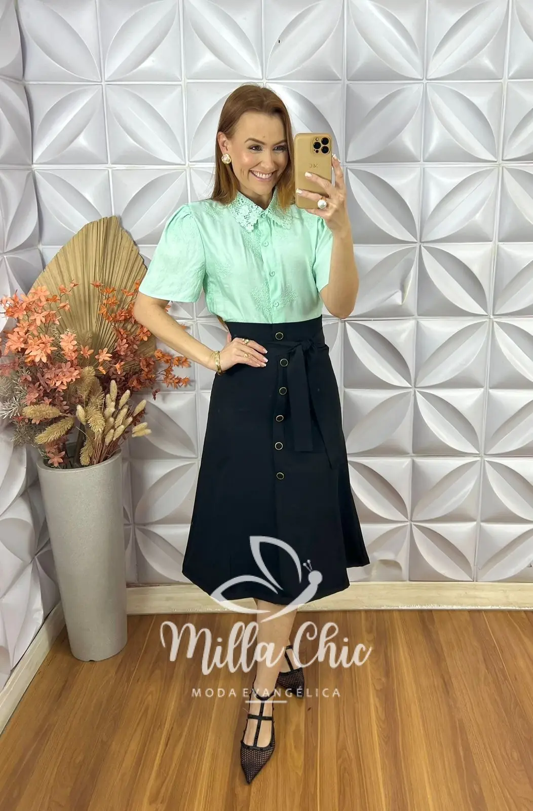 Botões funcionais e encapados a camisa Domênica vai deixar o seu look mais lindo .