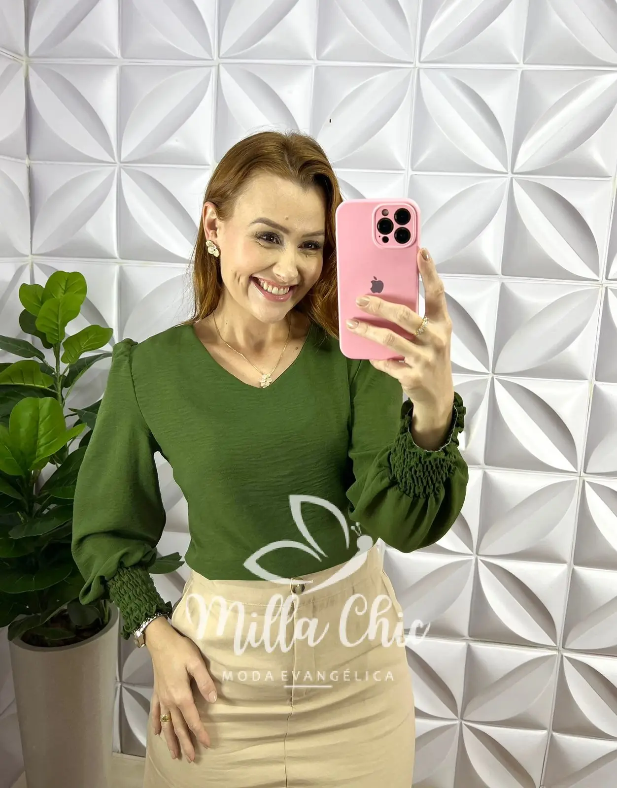 Possui: Gola V, manga princesa longa, punho marcado com Lastex, comprimento ideal. Peça versátil para usar o ano todo.