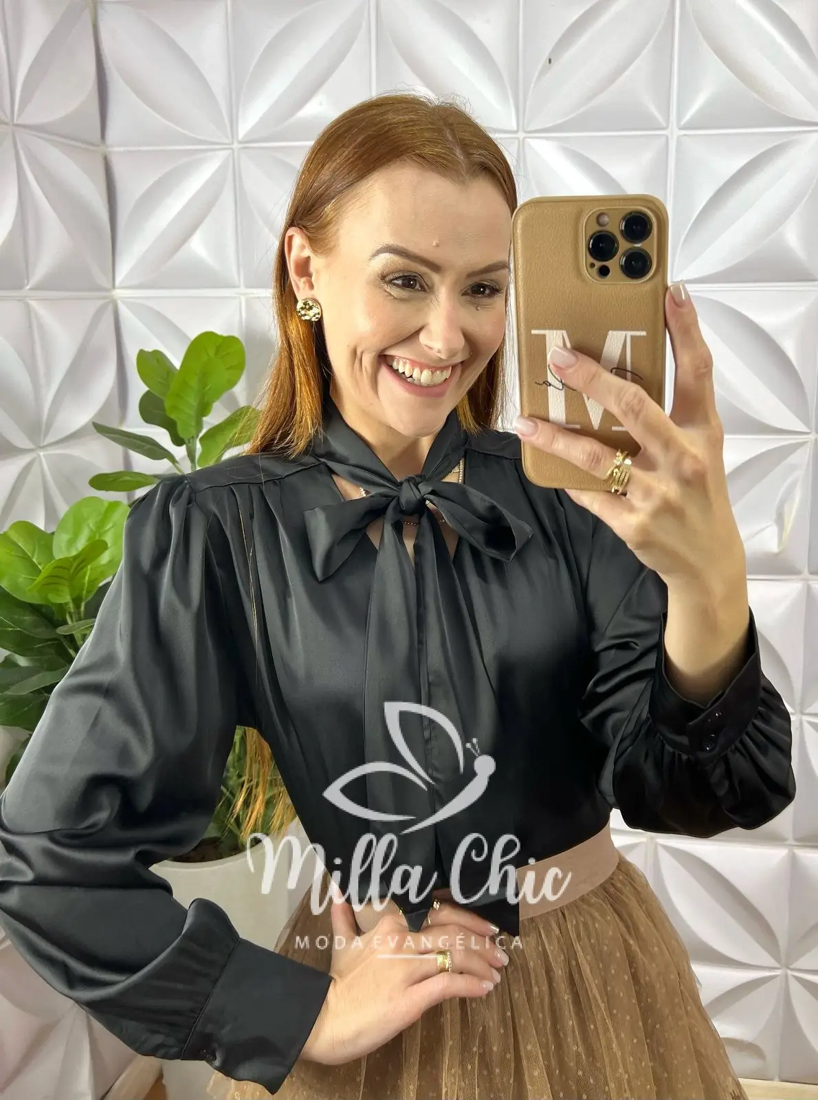 Ela conta com a sofisticação além do tecido a gola laço que passa romantismo , feminilidade e informação da moda.