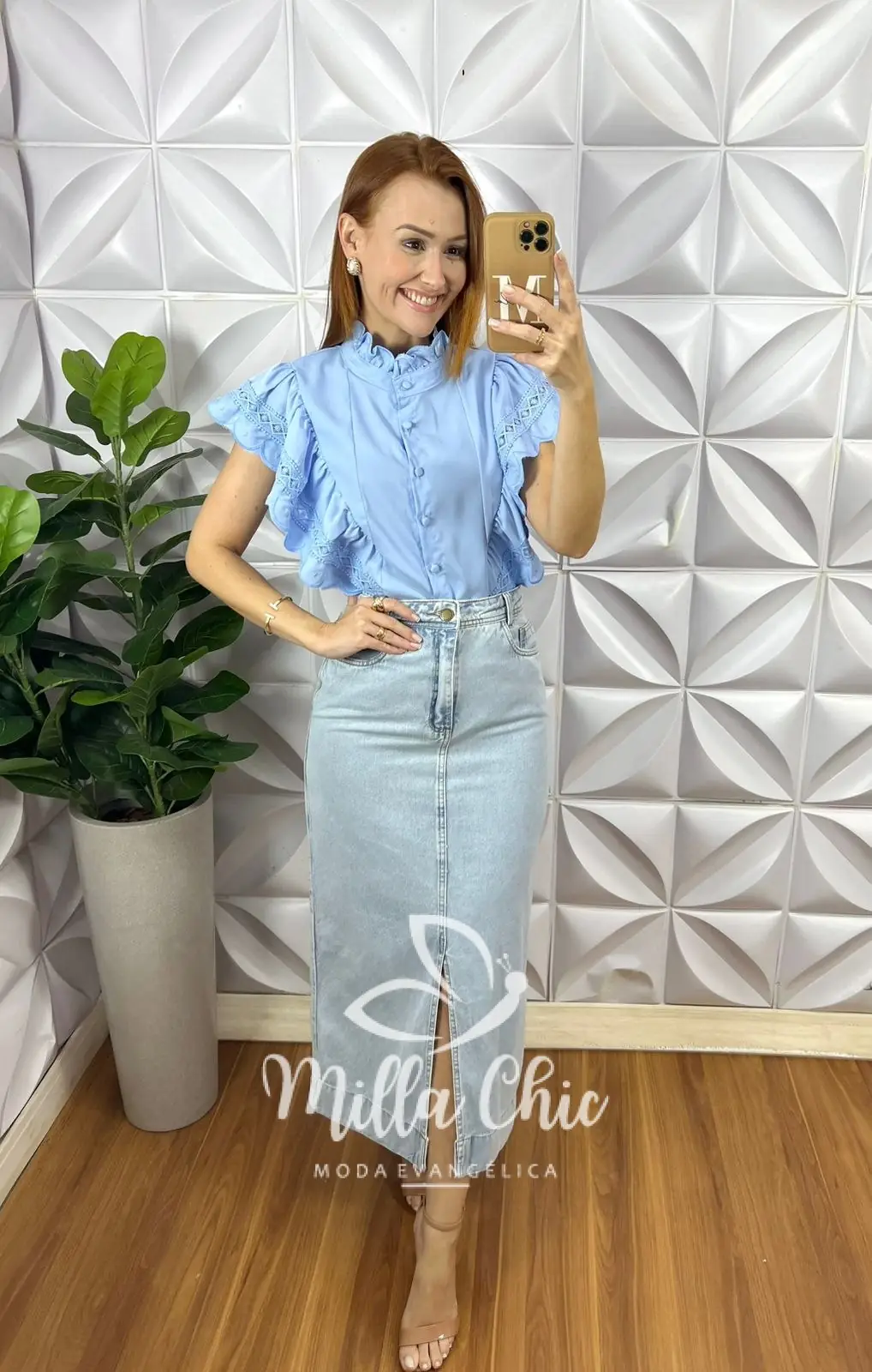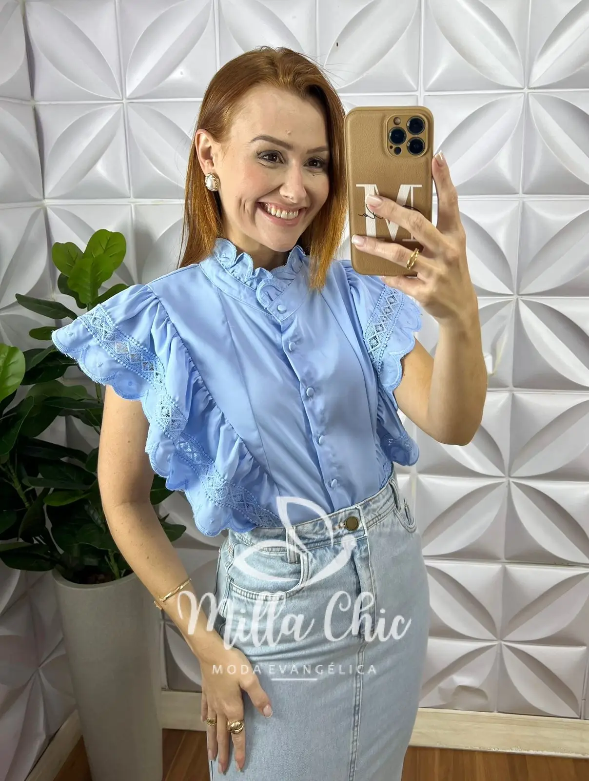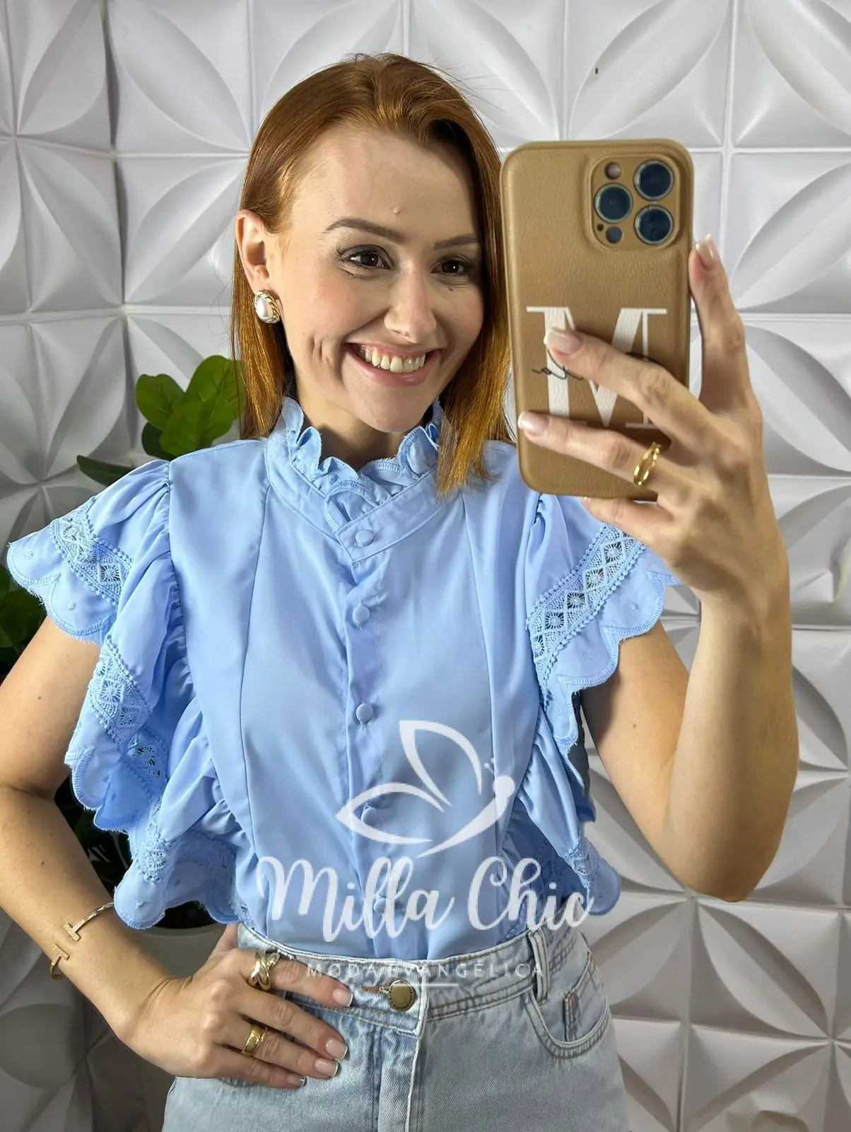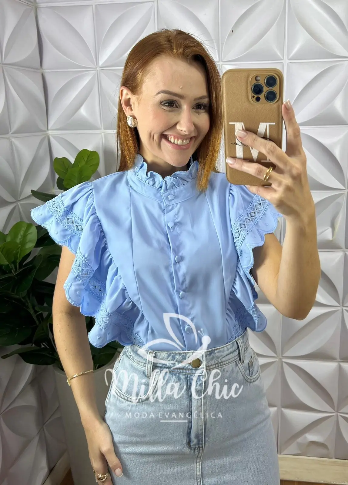 Nossa camisa Genébra possui botões funcionais e encapados que deixa ela mais chic . Uma camisa clássica com a gola alta que deixa ela bem elegante e com o toque em feminino e delicado dos babados com guipper .