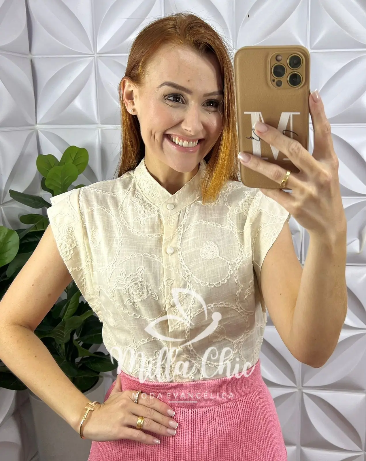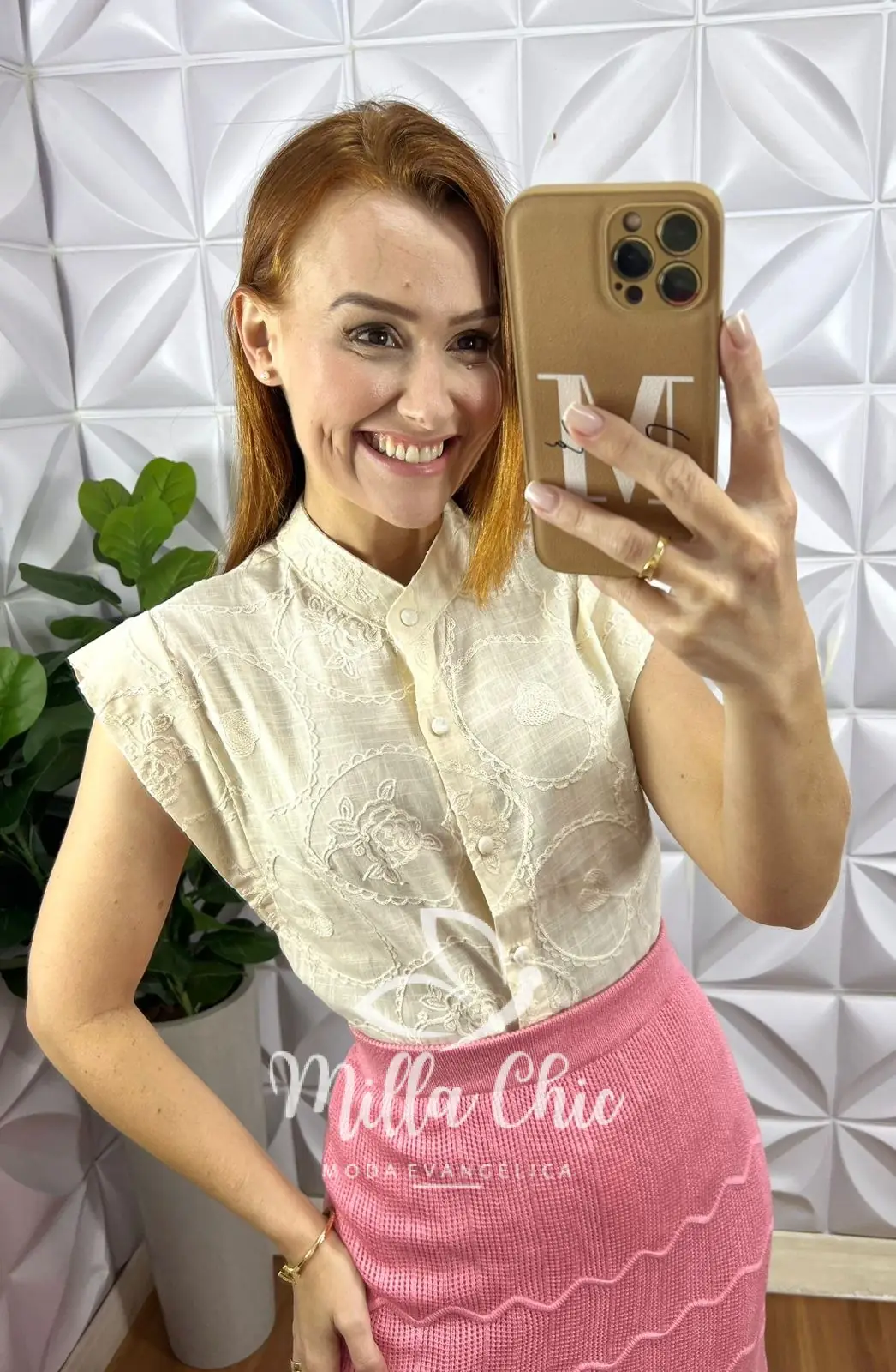 Camisa Gérbera Cambraia Linho - Areia - Milla Chic