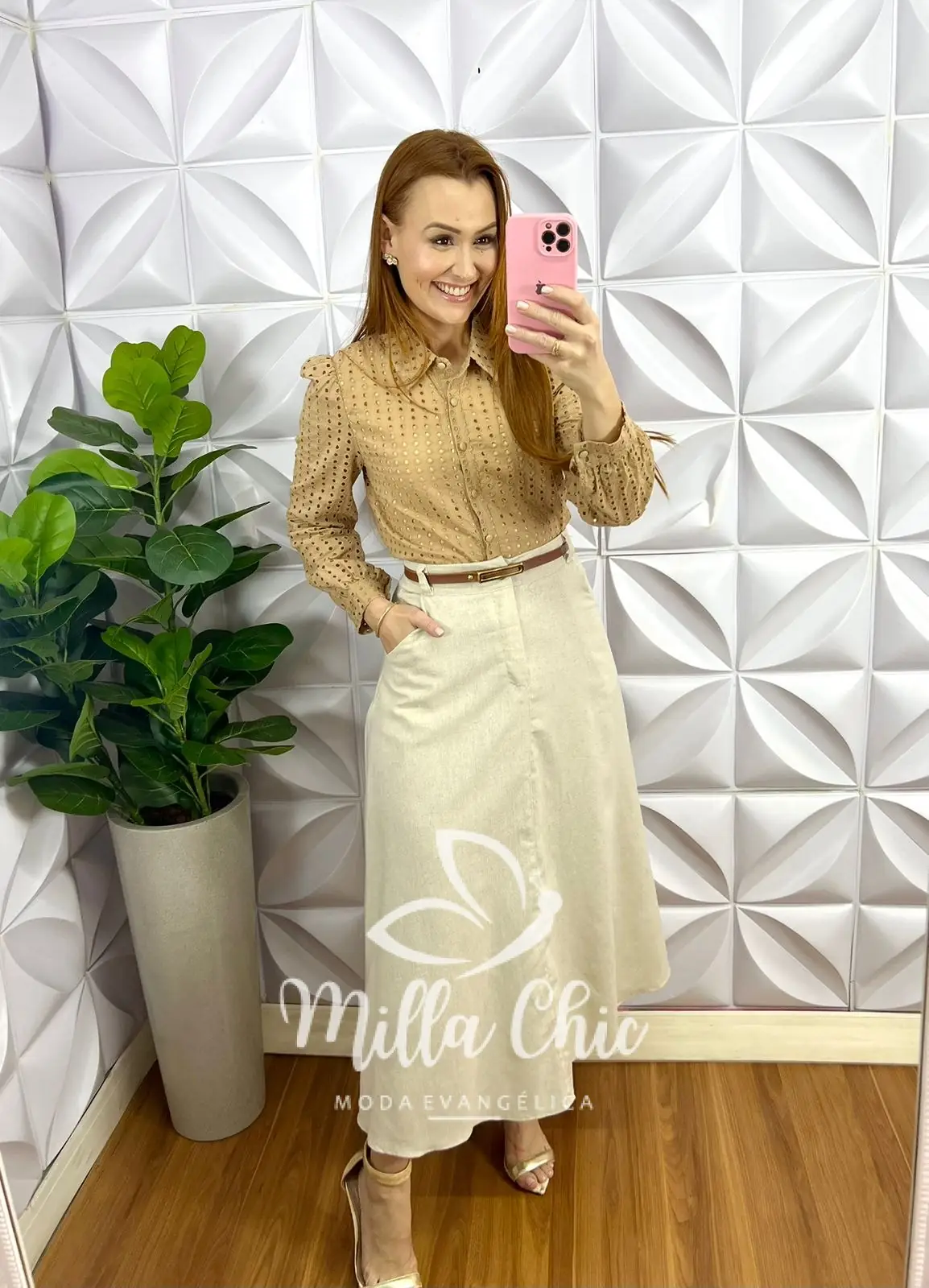 Camisa Lasie Manga Longa Botão Encapado Beatrice - Areia - Milla Chic