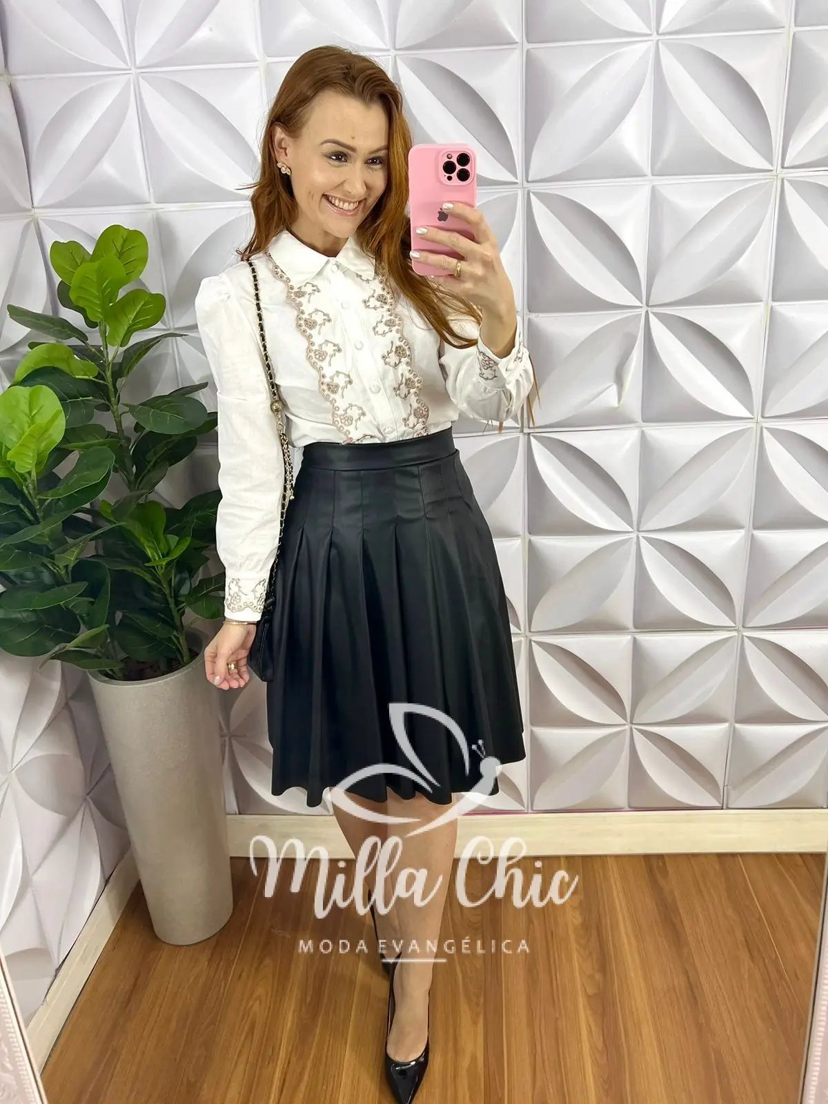 Saia Couro Toda De Pregas Ate o Joelho Havana - Preta - Milla Chic