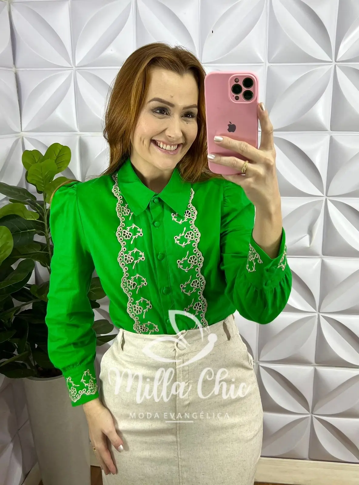 Camisa Linho Babado Sobreposto Bordado Manga Longa Zelândia - Verde - Milla Chic