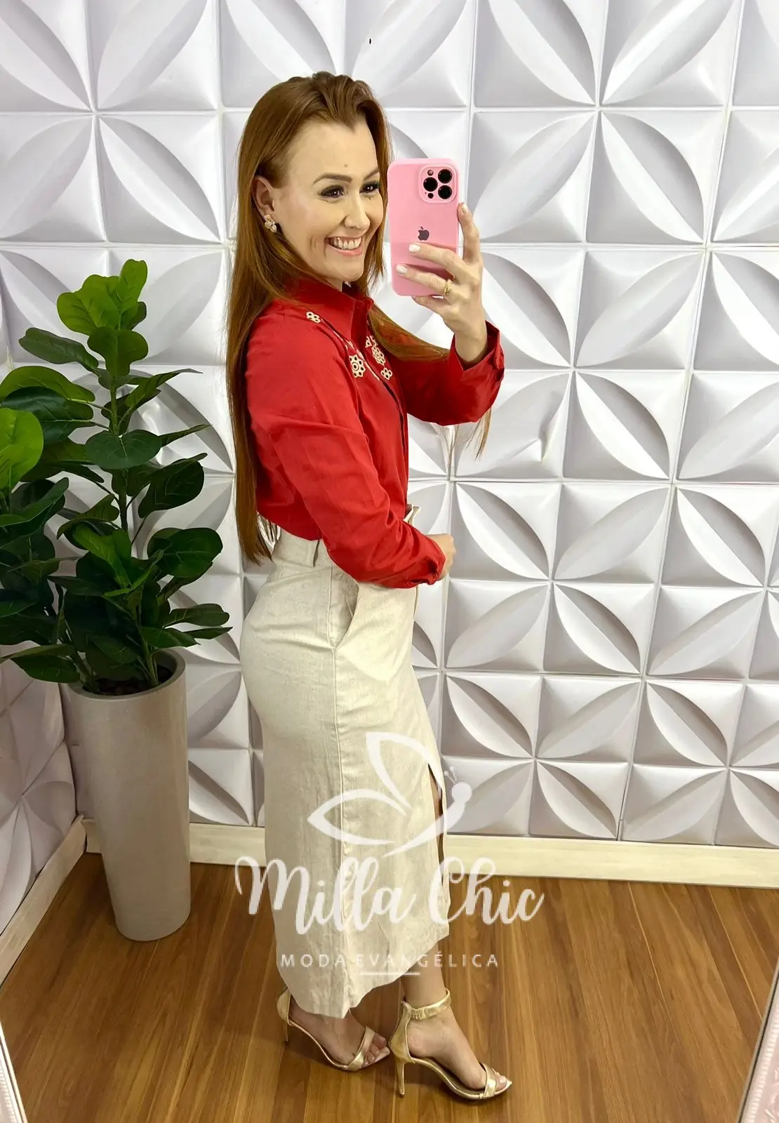 Camisa Linho Bordado Richilieu Manga Longa Brenda - Terra Cota - Milla Chic