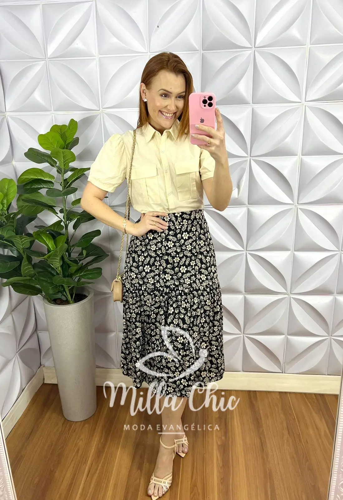 Saia Viscolinho Três Marias Estampada Marisa - Preta - Milla Chic