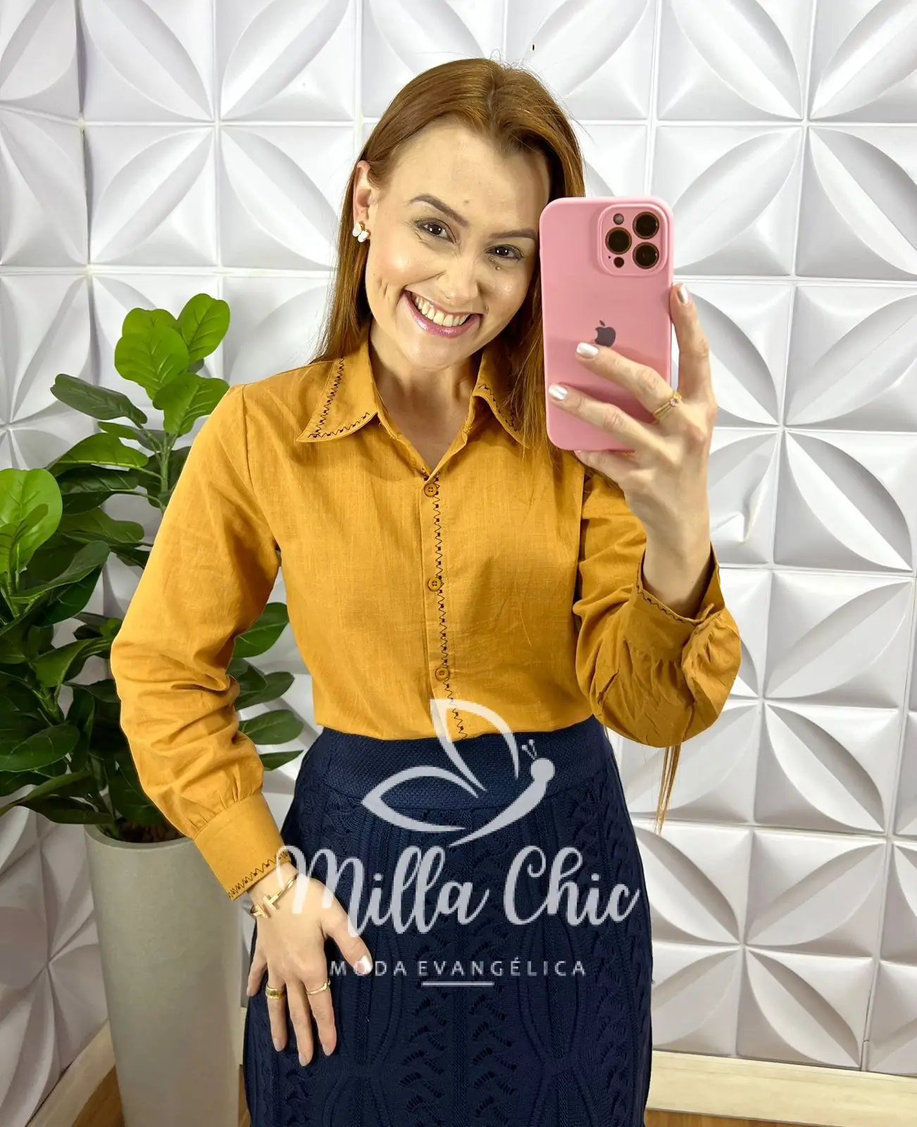 Camisa Linho Com Bordado de Maquina Manga Longa Flavia - Mostarda Escuro - Milla Chic