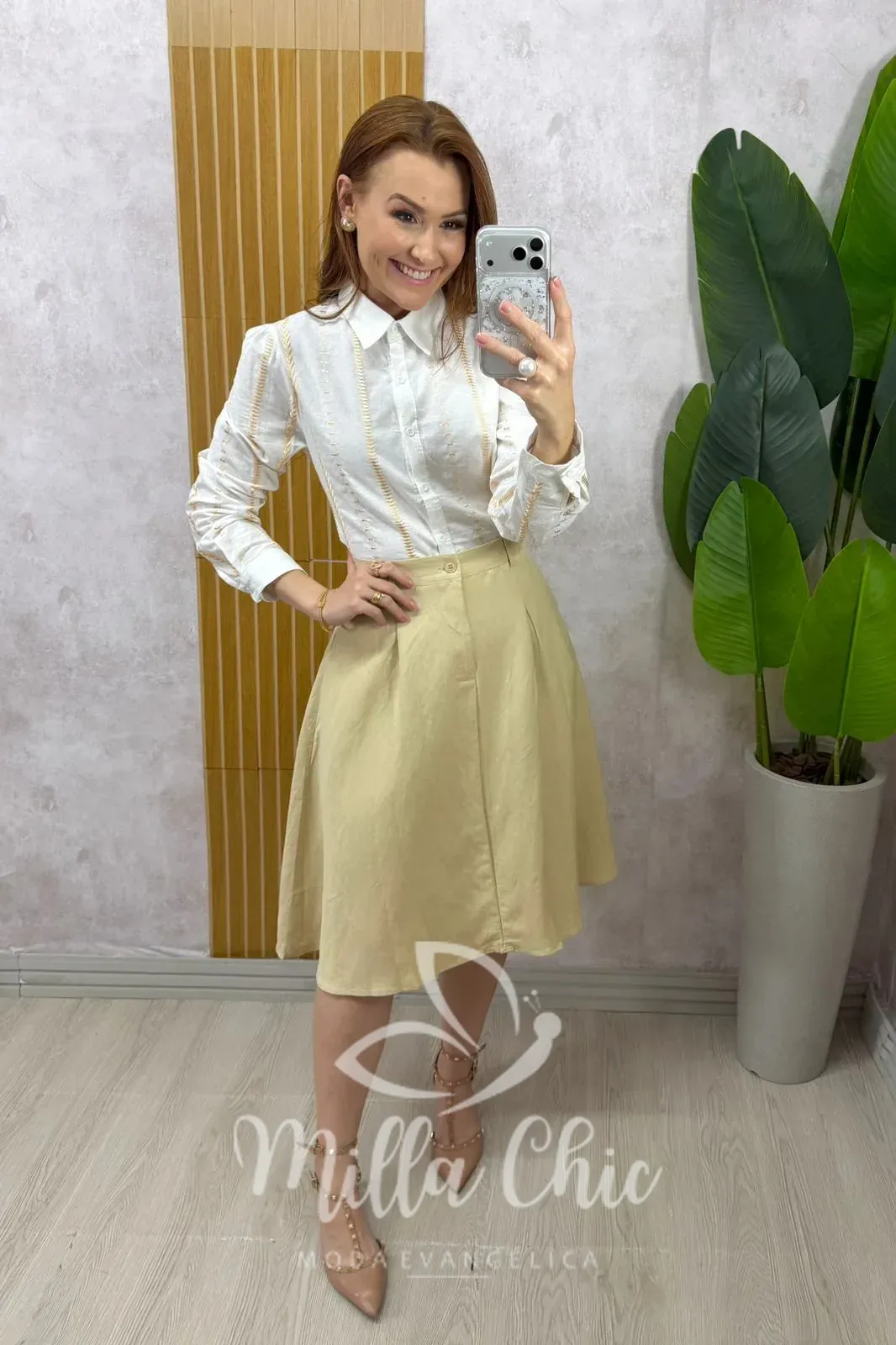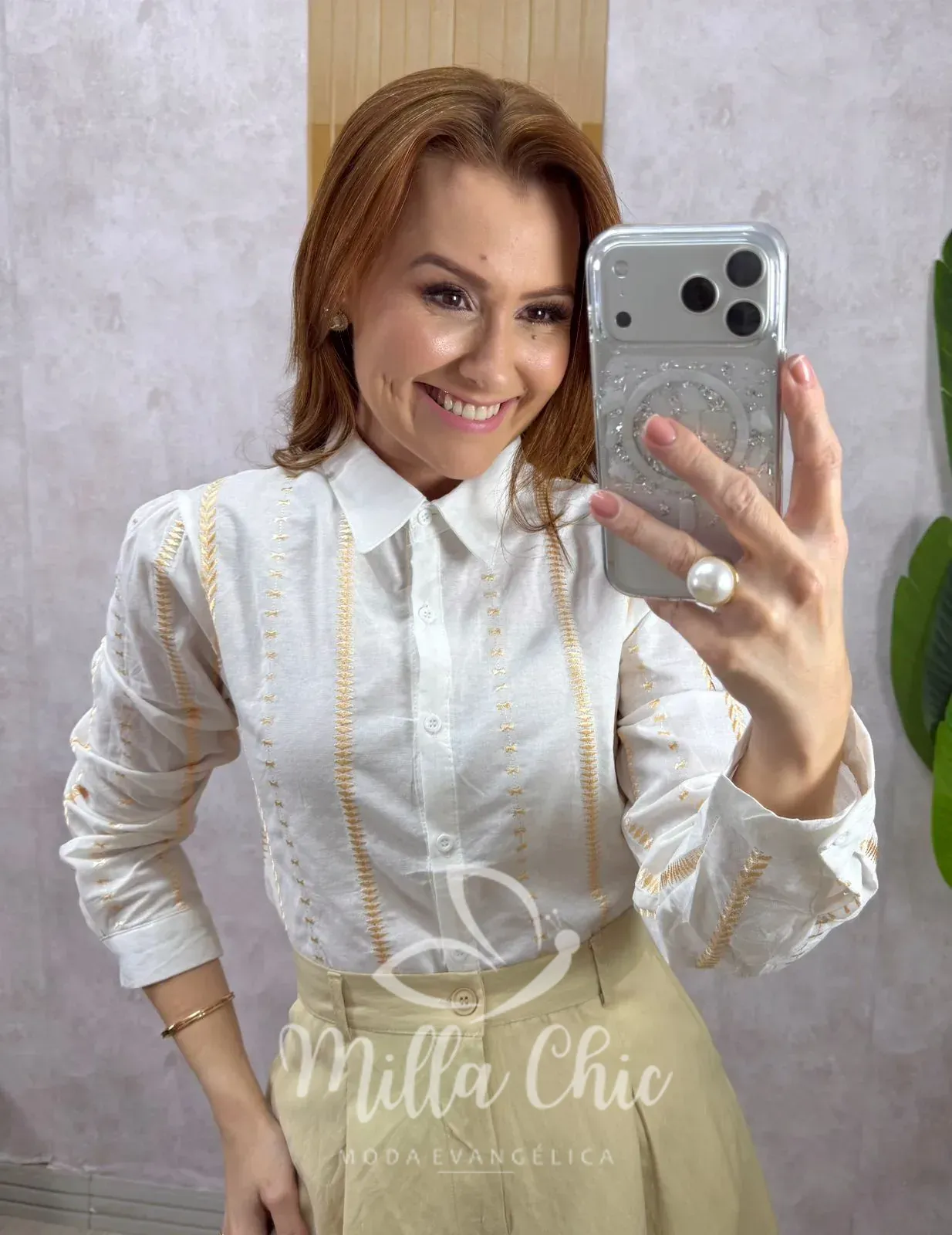 Totalmente bordada em máquina, seus detalhes em fio dourado com acabamento acetinado trazem um brilho sutil e refinado, elevando a peça com delicadeza.
