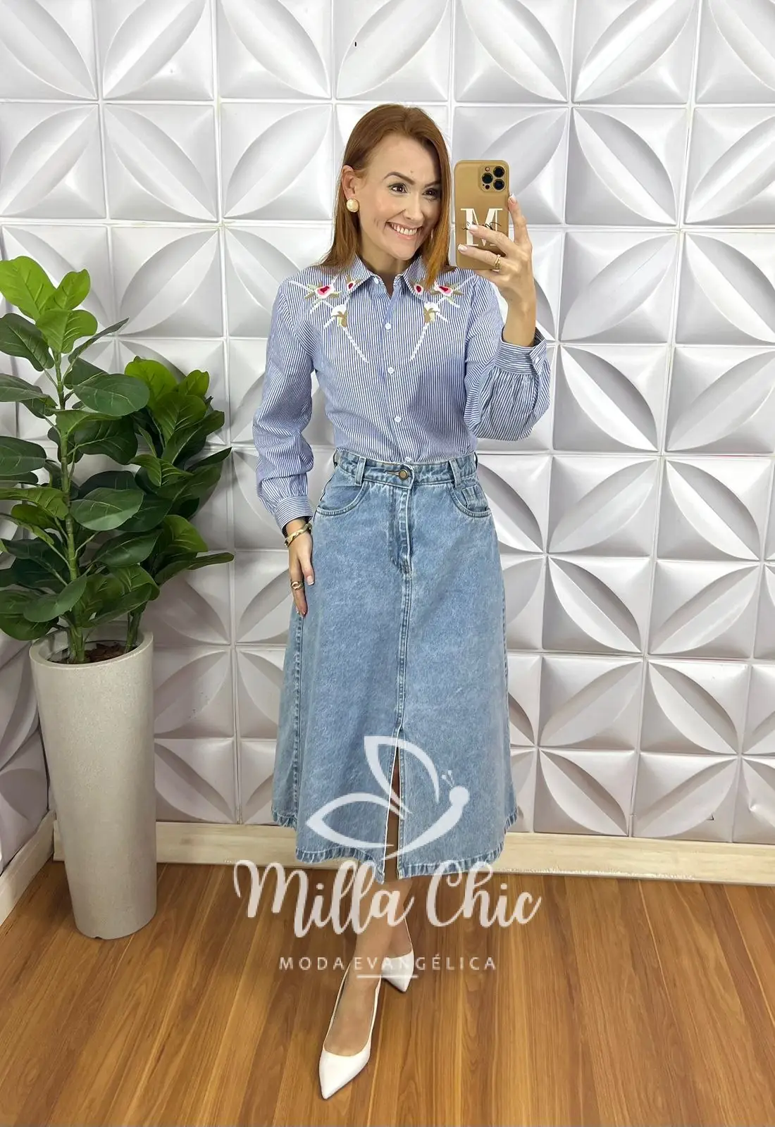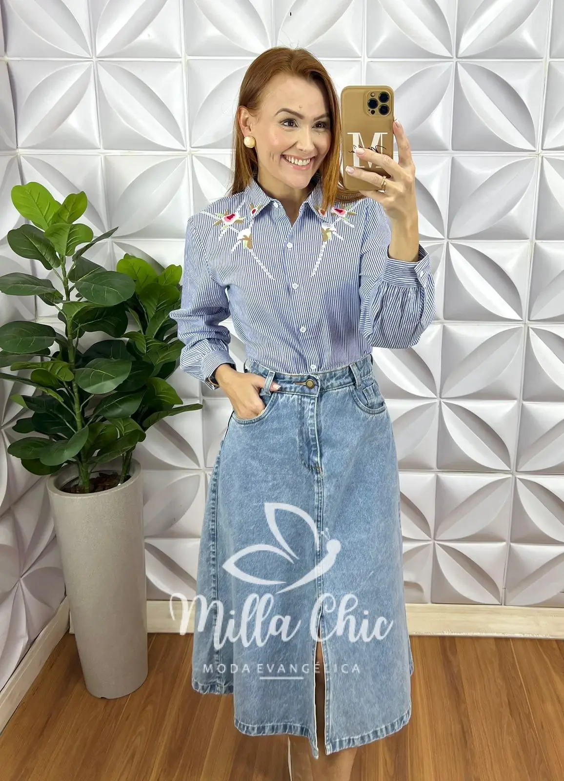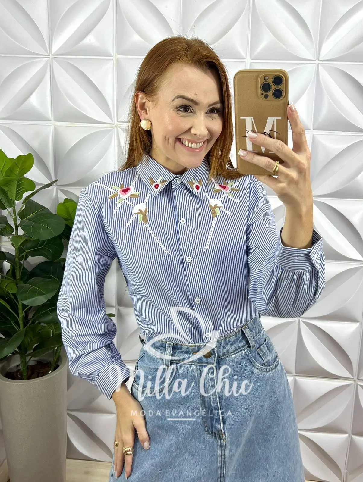 Listras é atemporal não cai de moda e deixa você muito elegante . Uma camisa clássica com o toque do bordado que deixou ela delicada e mais chic .