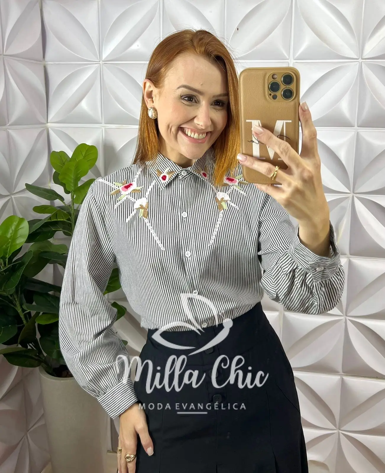Listras é atemporal não cai de moda e deixa você muito elegante . Uma camisa clássica com o toque do bordado que deixou ela delicada e mais chic .