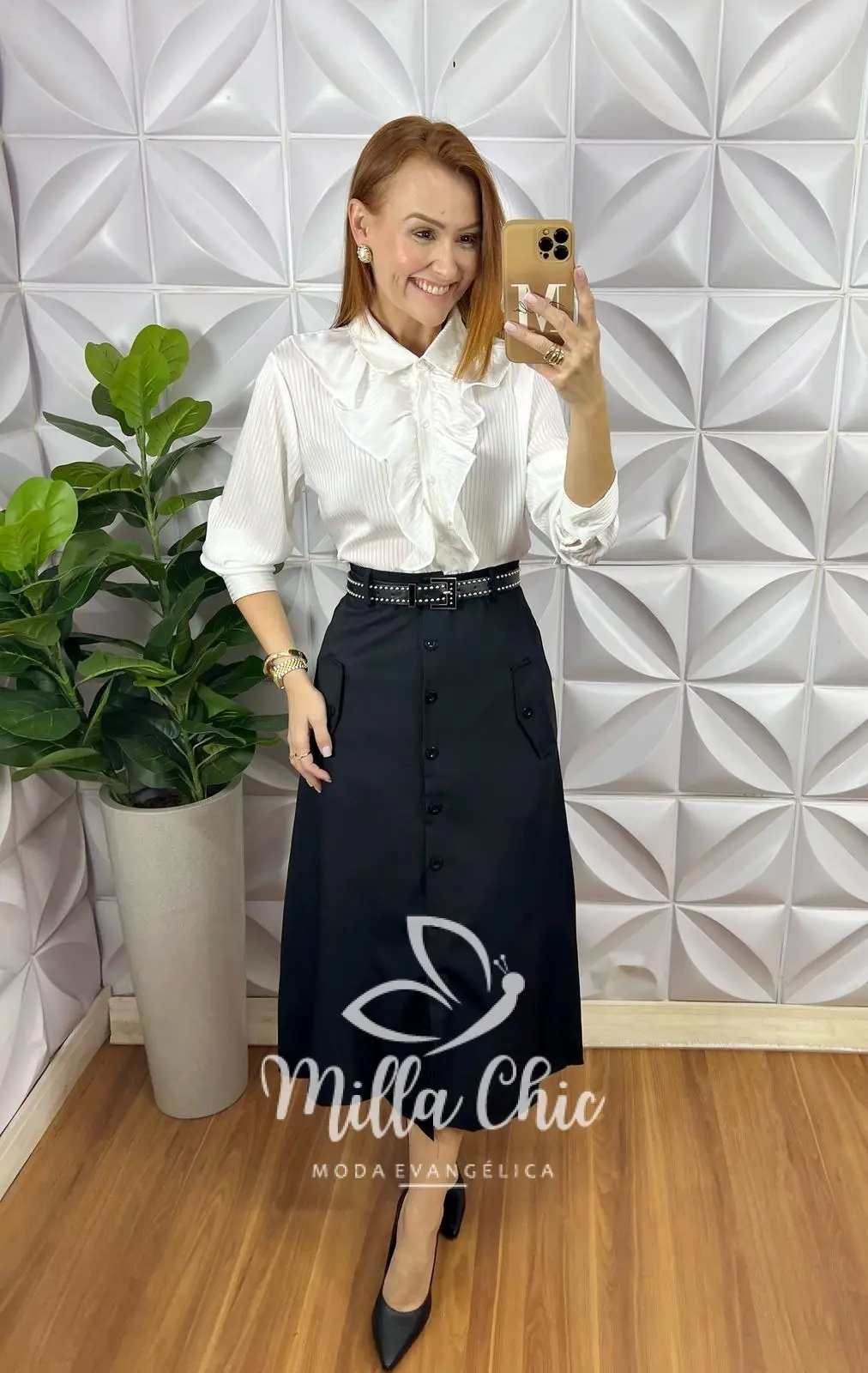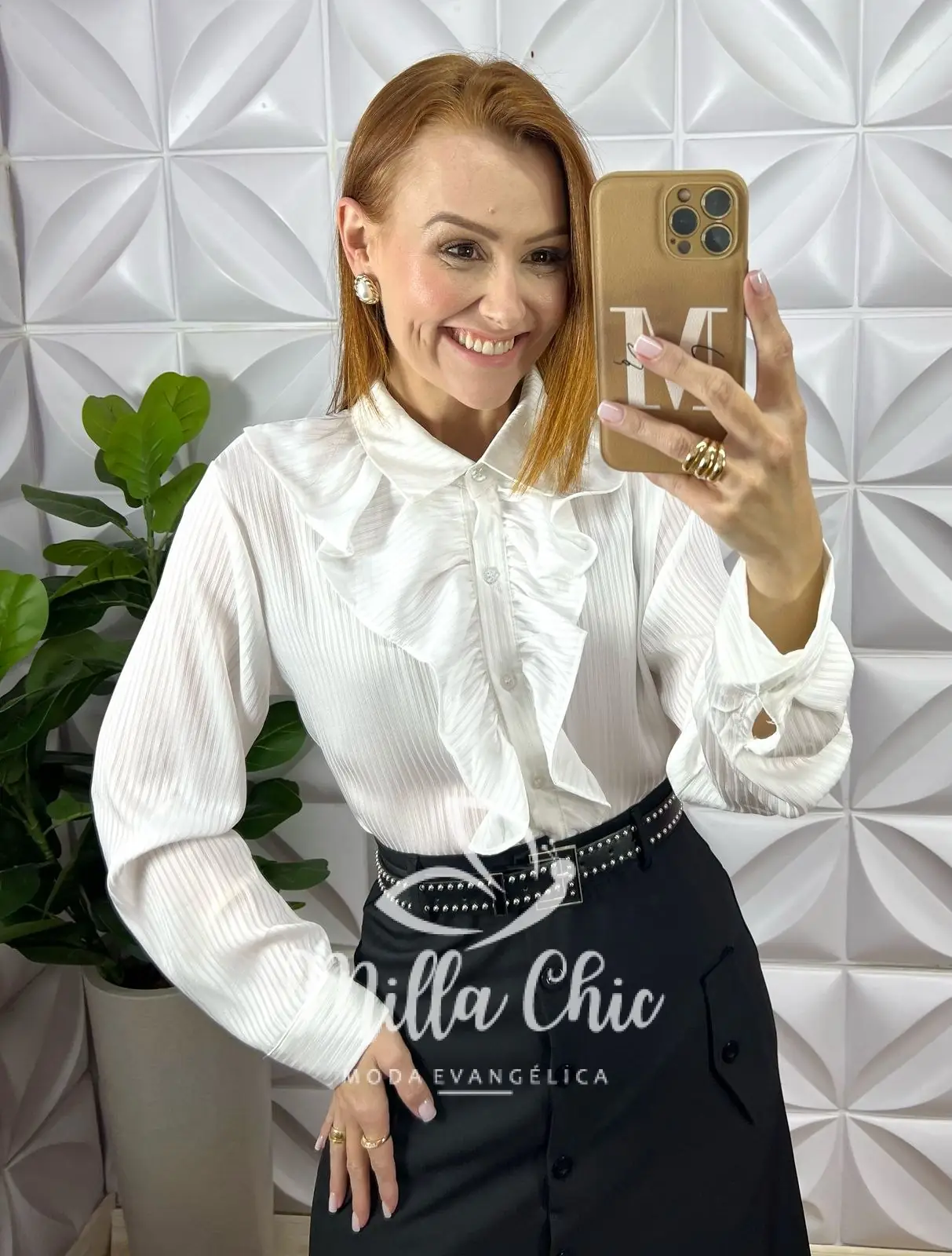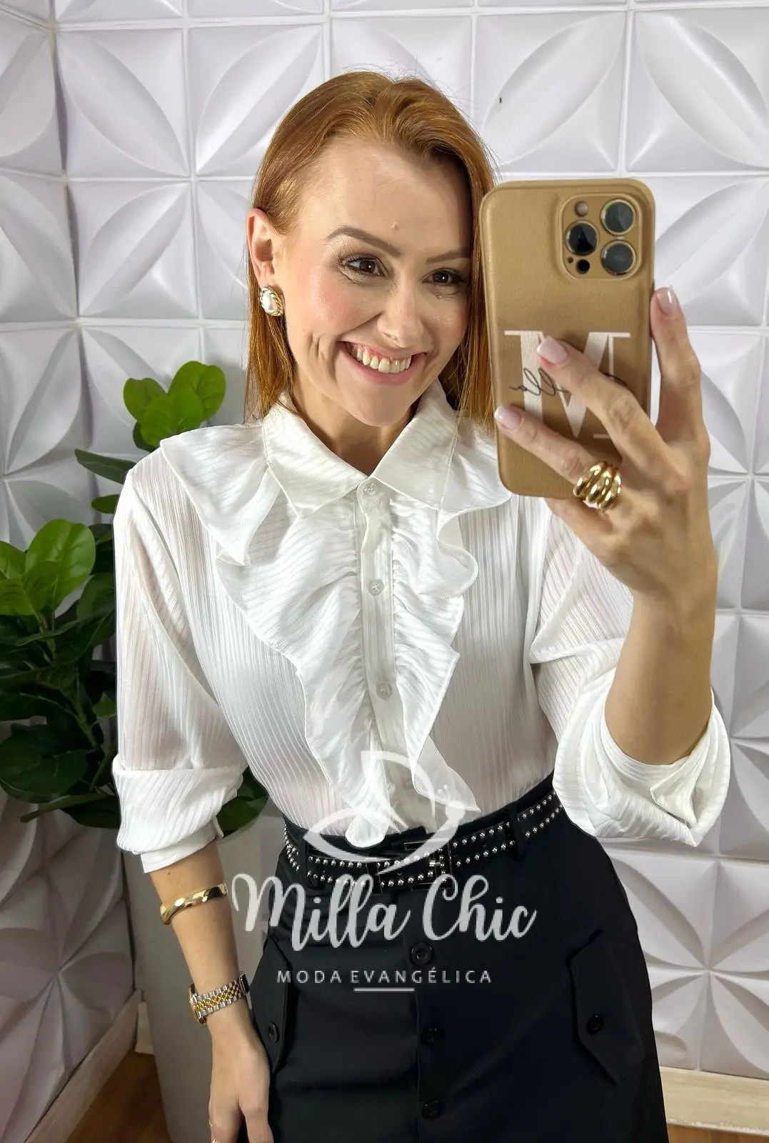 Aquela camisa clássica e chic . Com os babados na frente que são super tendência e da o charme especial para ela e uma elegância sem igual .