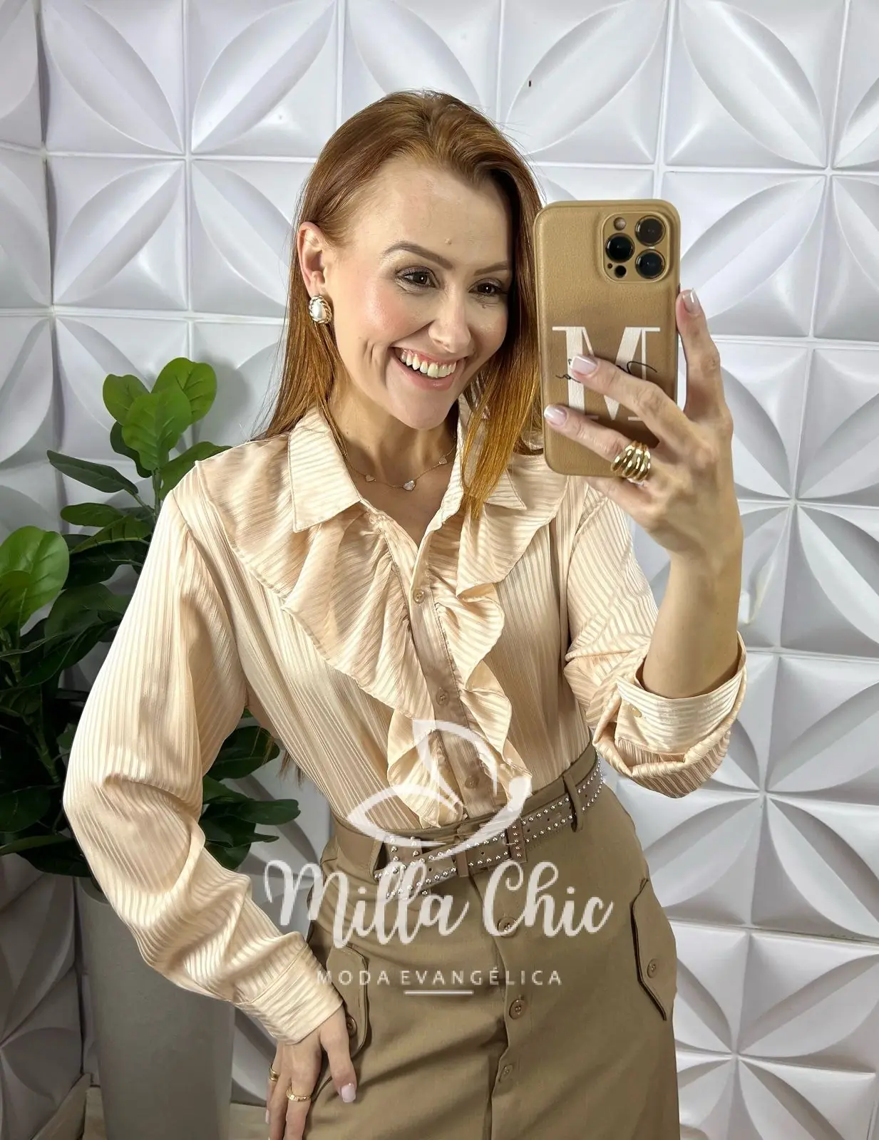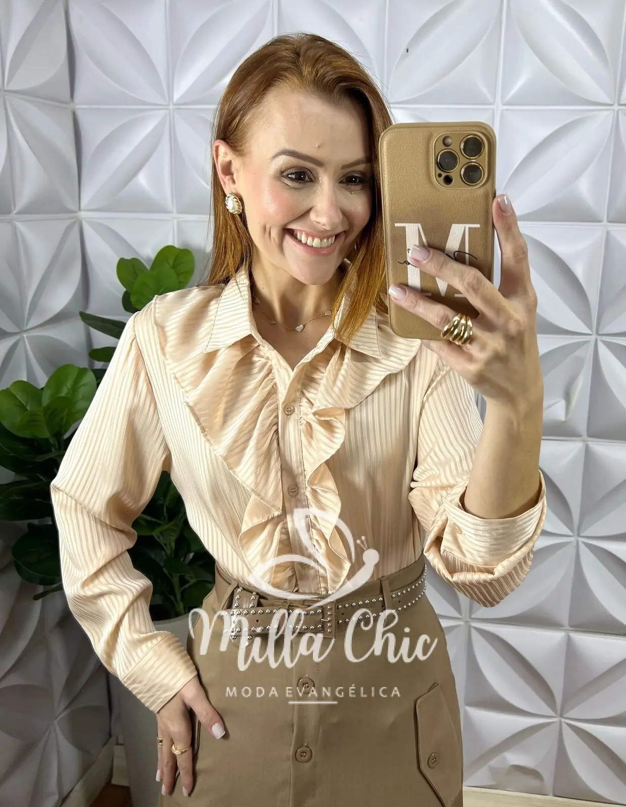 Aquela camisa clássica e chic . Com os babados na frente que são super tendência e da o charme especial para ela e uma elegância sem igual .