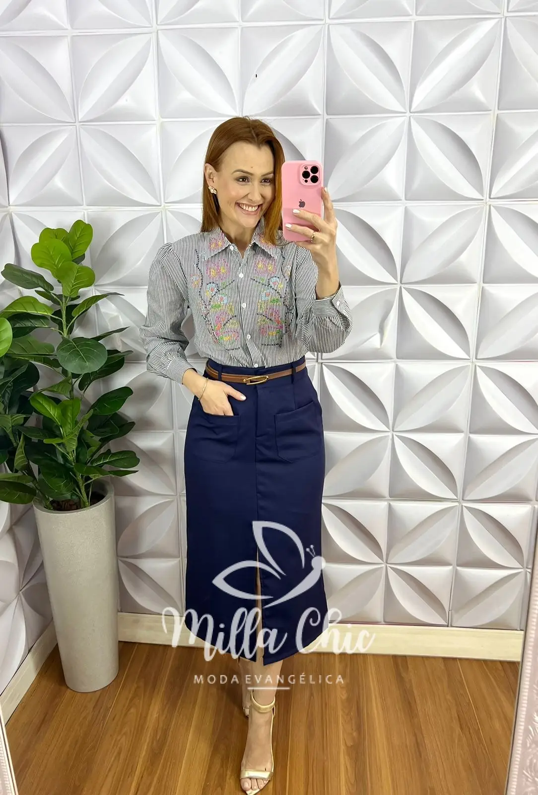 Saia Alfaiataria Mídi Reto Com Bolsos Celina - Azul - Milla Chic