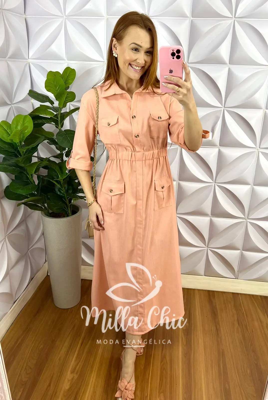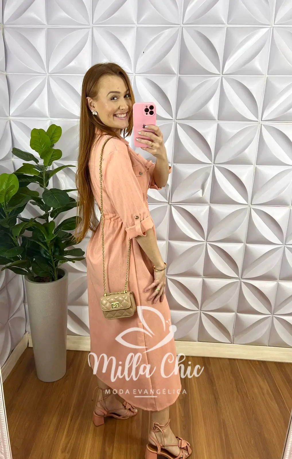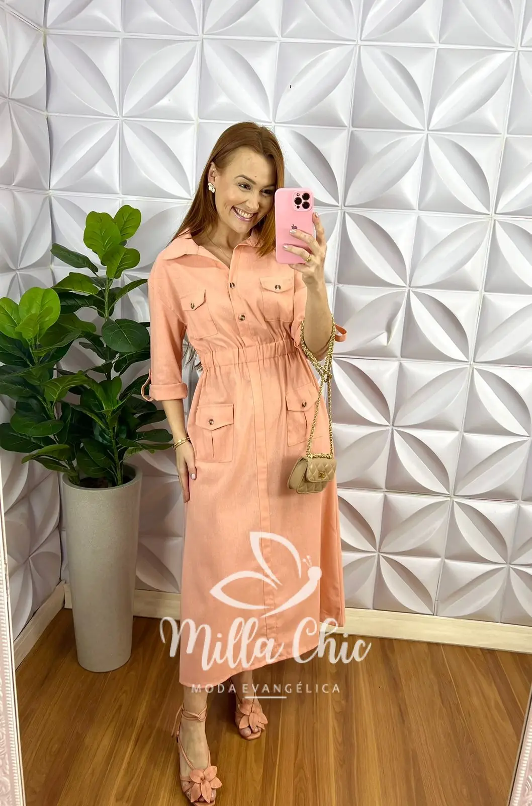 Chemise Linho Com Elástico Na Cintura E Bolso Janaina - Pêssego - Milla Chic