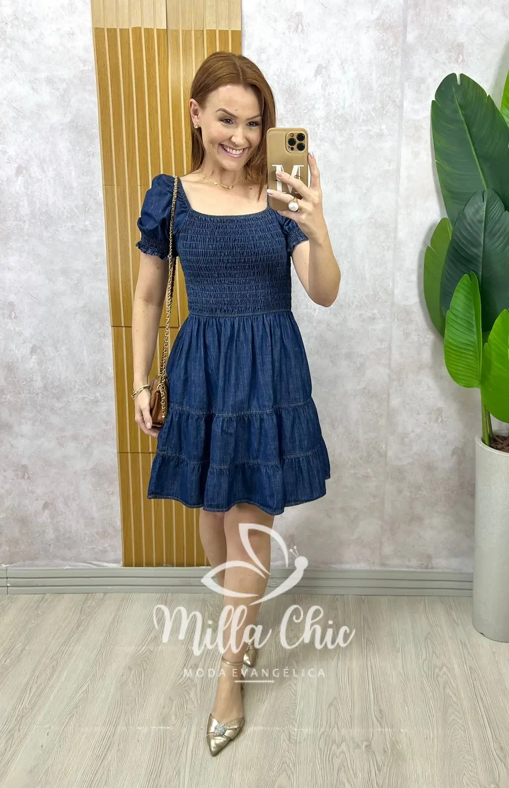 Confeccionado em jeans de caimento levemente encorpado, o vestido oferece um toque macio e é muito confortável. Sua modelagem com elastex na parte da blusa e a saia toda com pregas proporciona leveza e movimento. Um vestido atemporal e muito prático e versátil tornando-a ideal para o dia a dia.
