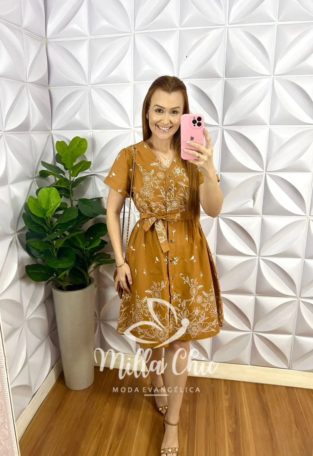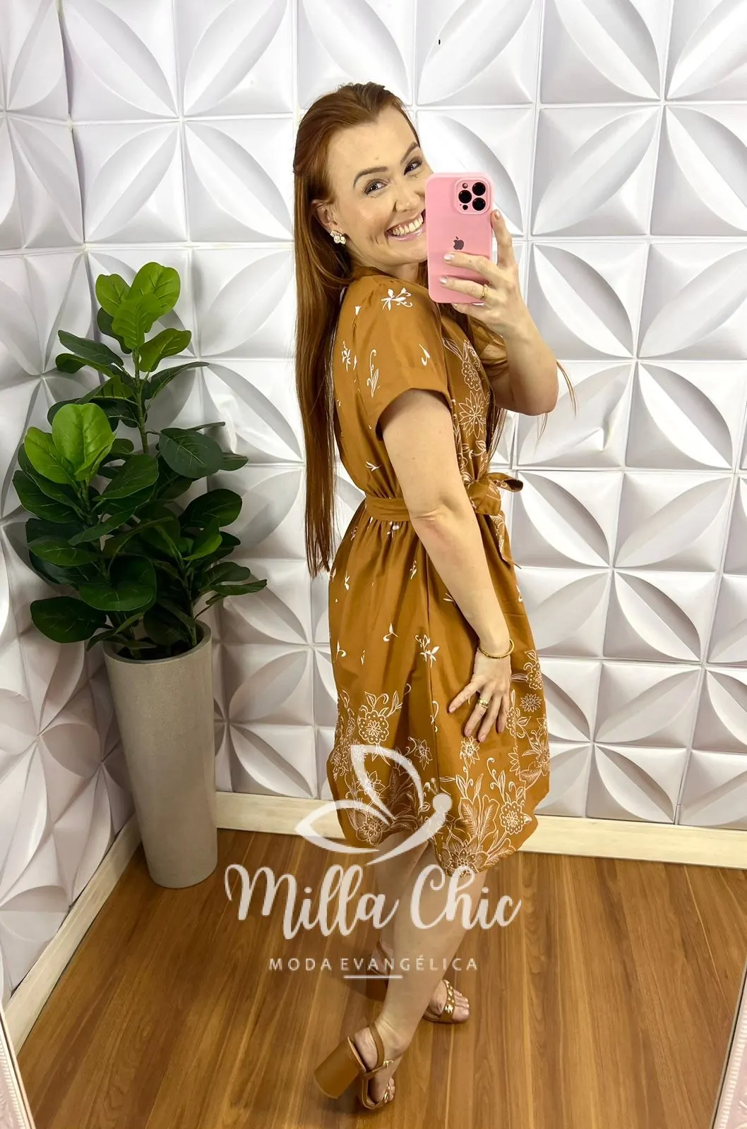 Chemise Tricoline Com Faixa Cinto Estampado Jamily - Capuchino - Milla Chic