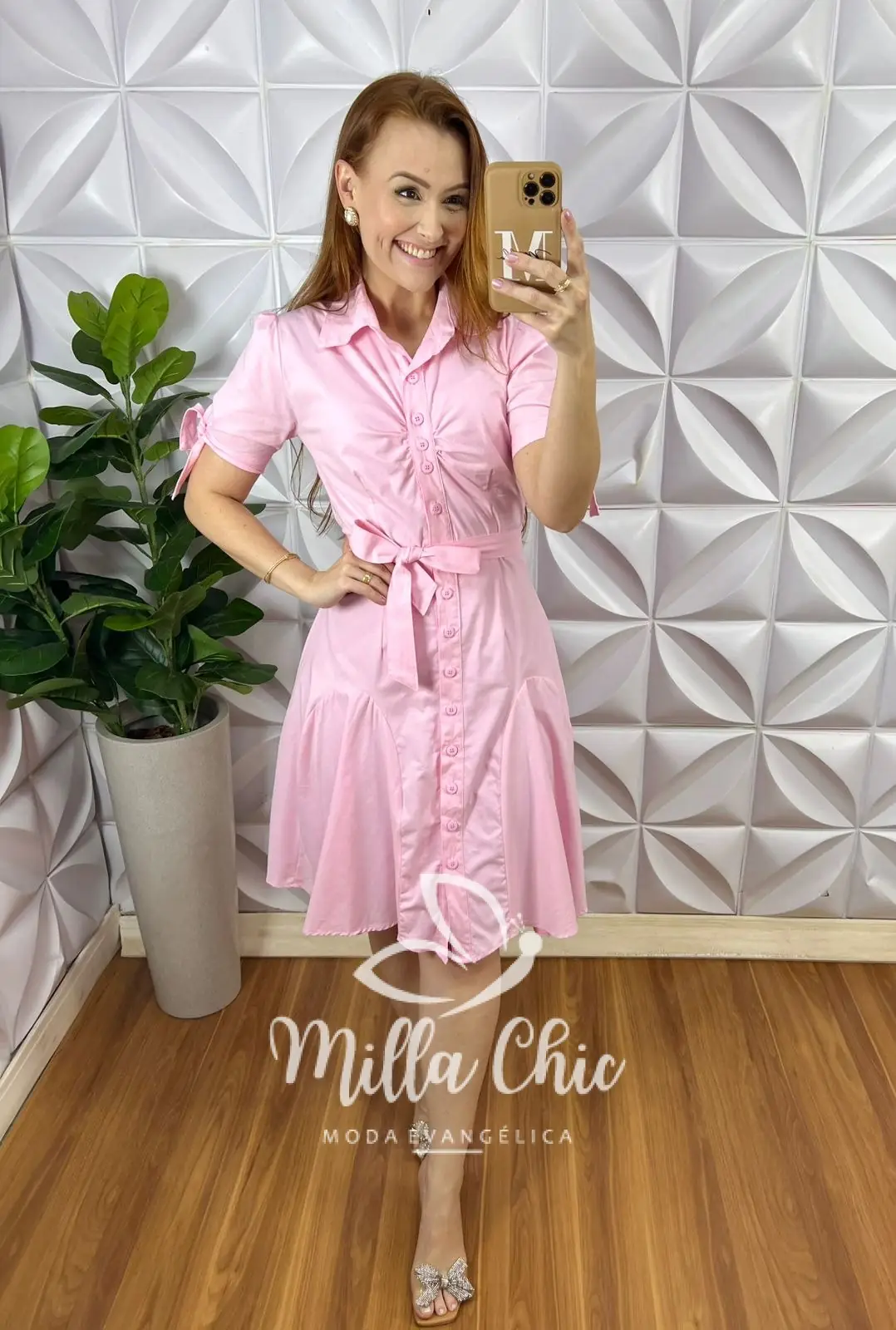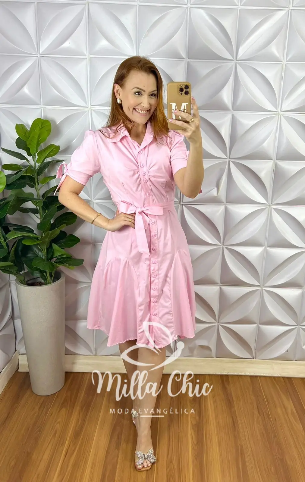 Possui: Gola Polo, manga princesa com fita na barra para laço, leve drapeados no busto, todo de botões funcionais, caimento evasê, modelo pizza com recortes, comprimento ate o joelho. Acompanha cinto faixa e camisolinha lisa de alcinha.